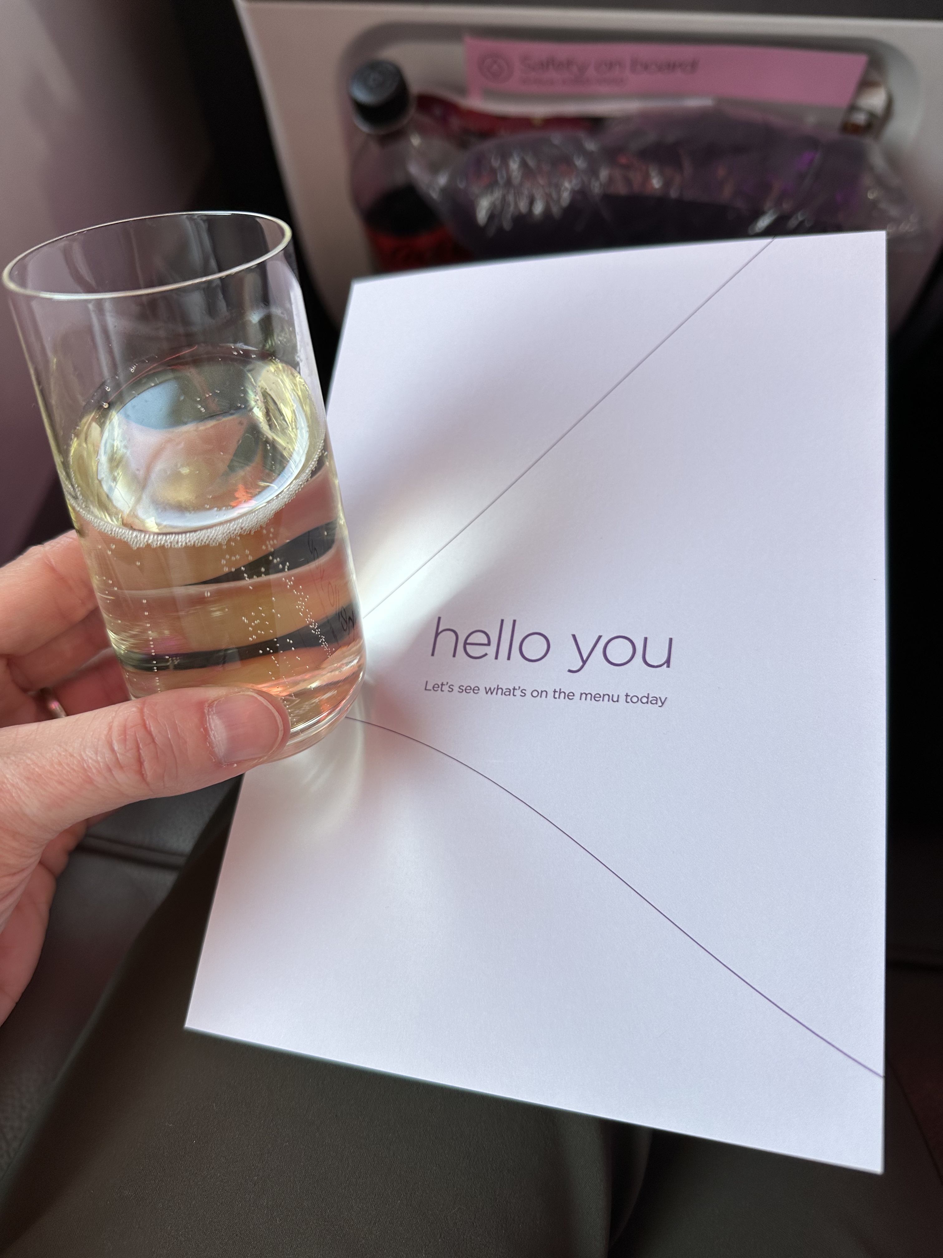 The boarding process was fairly quick even with the passport validation step. It was a bit interesting to see Delta staff working the counter (purple uniforms) but once onboard it was clearly a Virgin Atlantic flight (red uniforms). My ticket was for the premium class cabin. For those familiar with US domestic flights, think the first class cabin. I was not in a lay flat bed seat but did have plenty of room to stash my carry on and personal item. The premium cabin was set up in a 2-4-2 configuration and I was in the one of the 2 seat sections. The flight turned out to be at roughly 1/3 capacity so there were open seats in all the cabins. I did have a seatmate for the flight as neither I nor the gentleman next to me particularly minded.