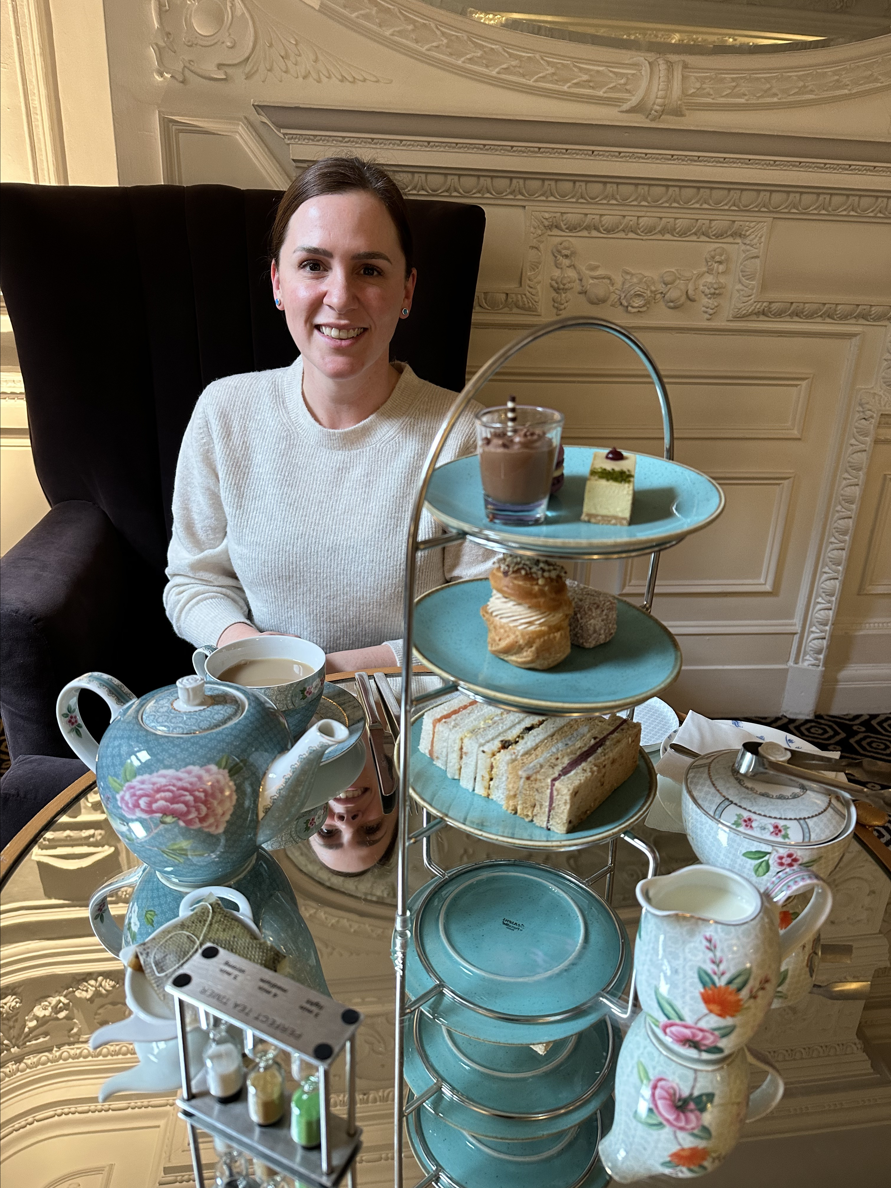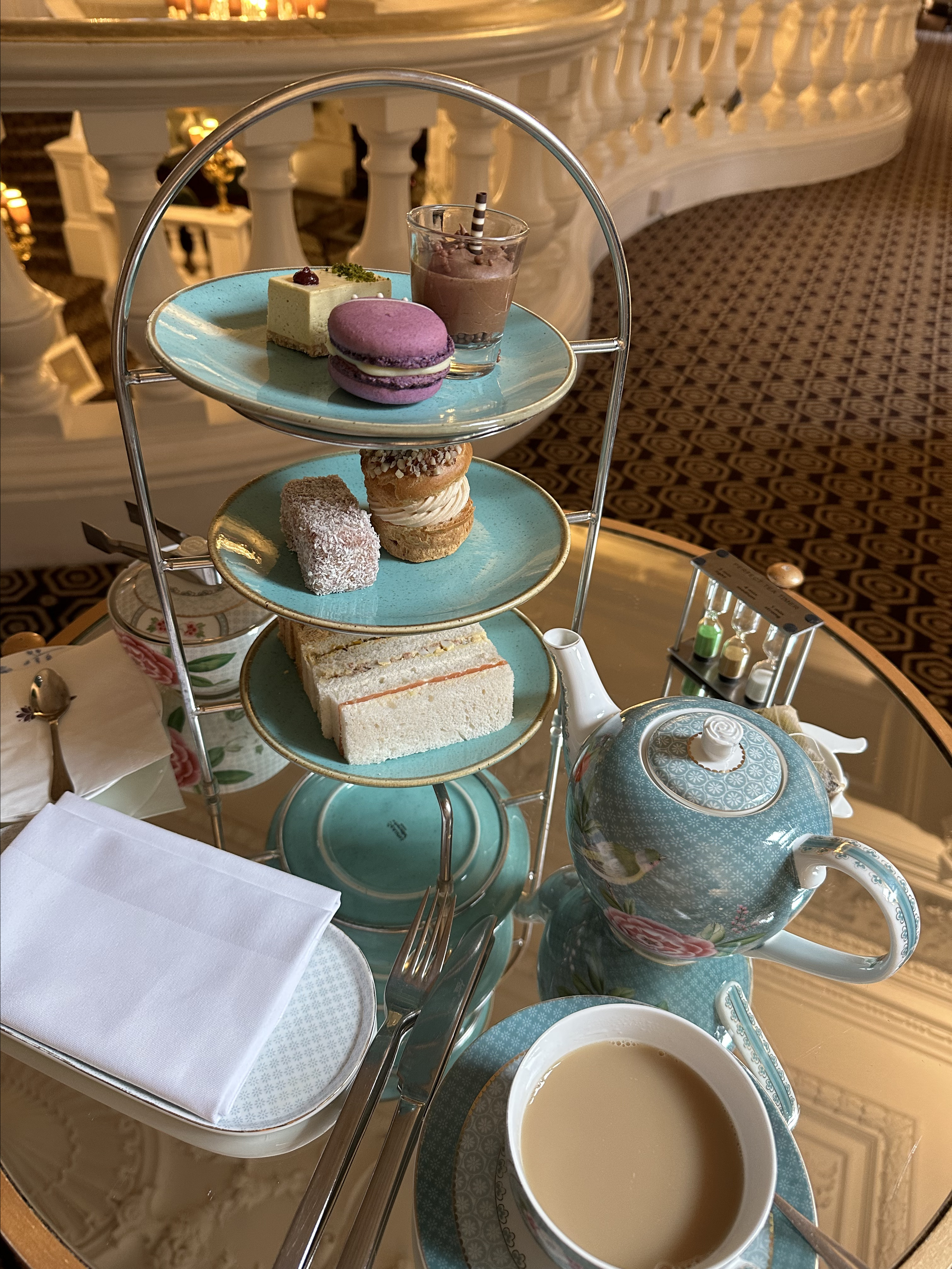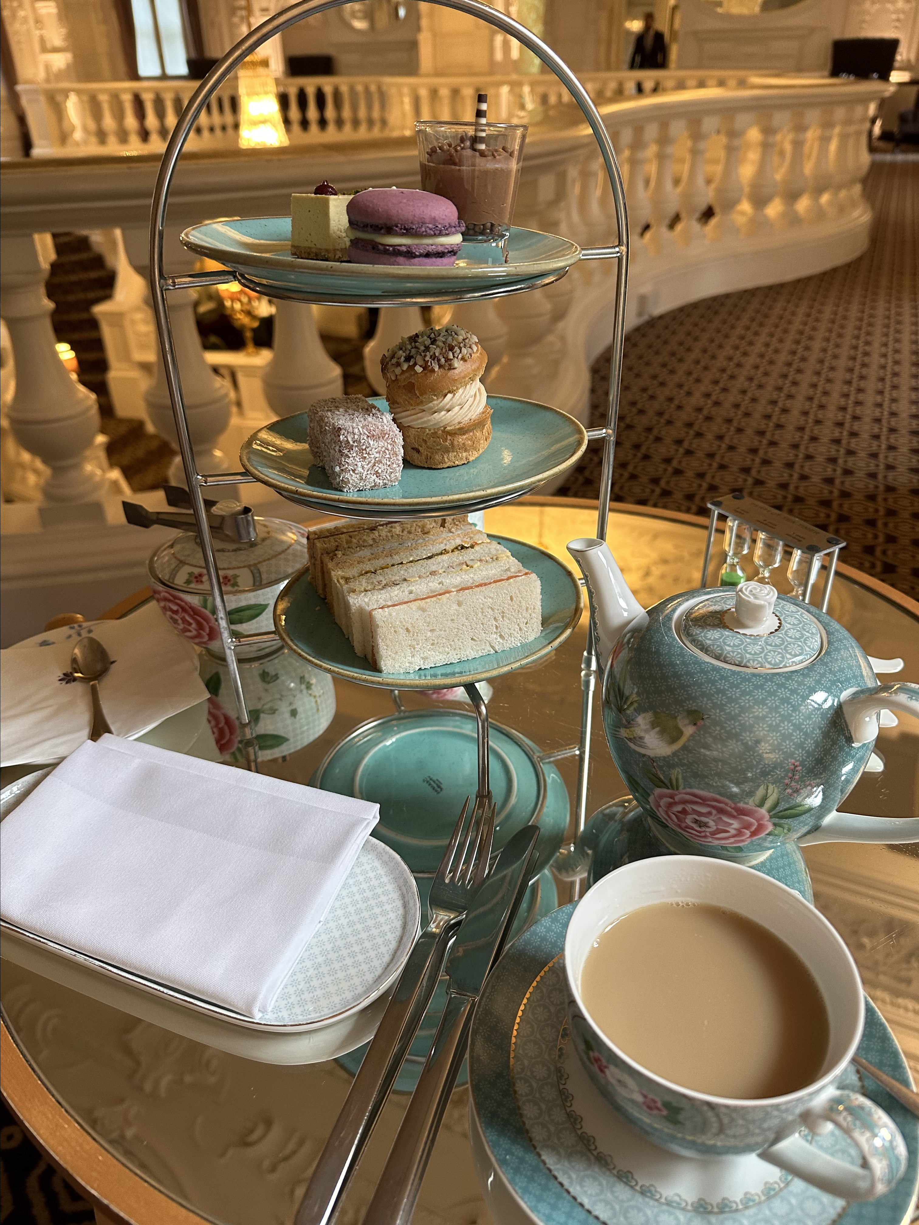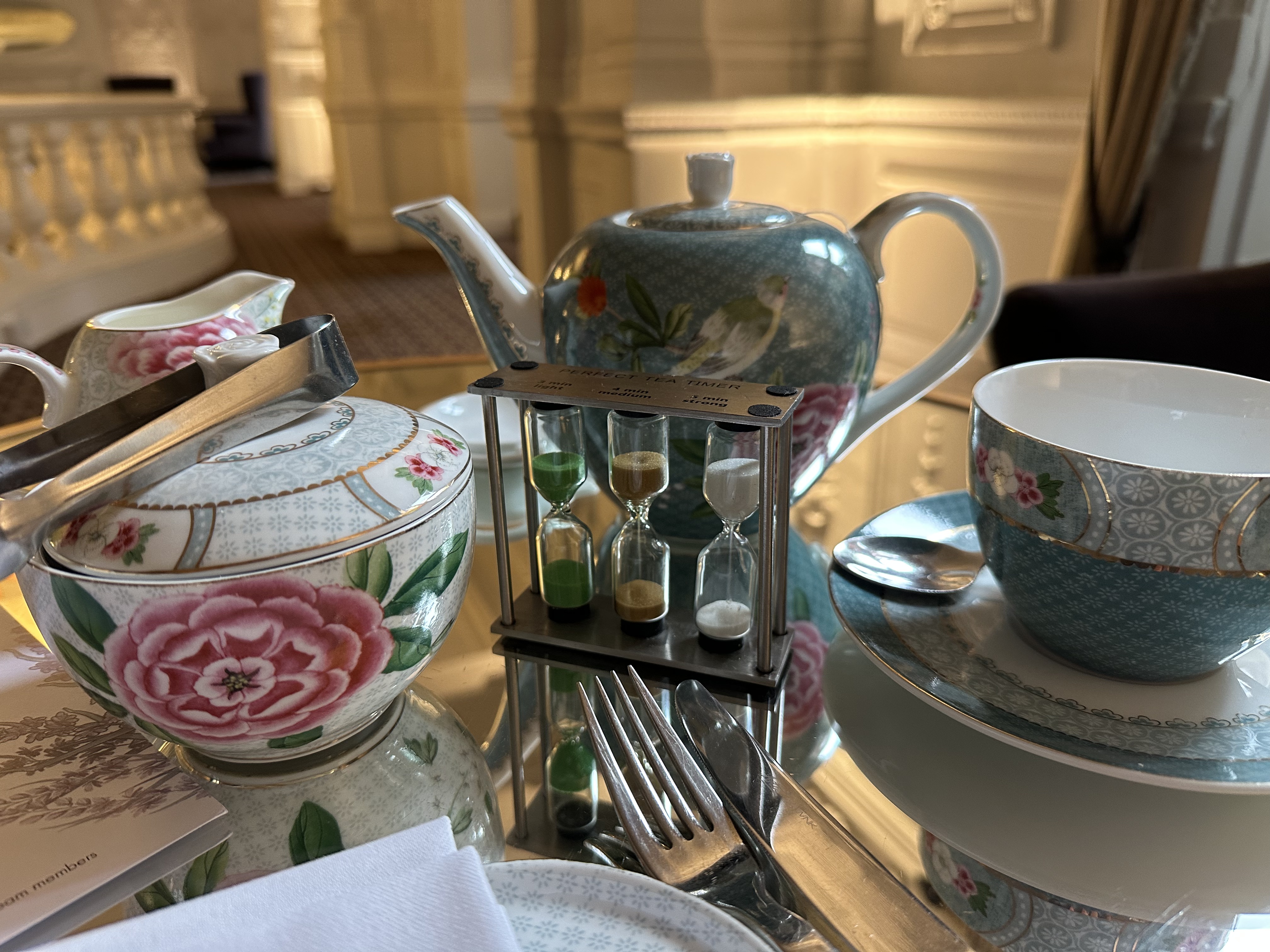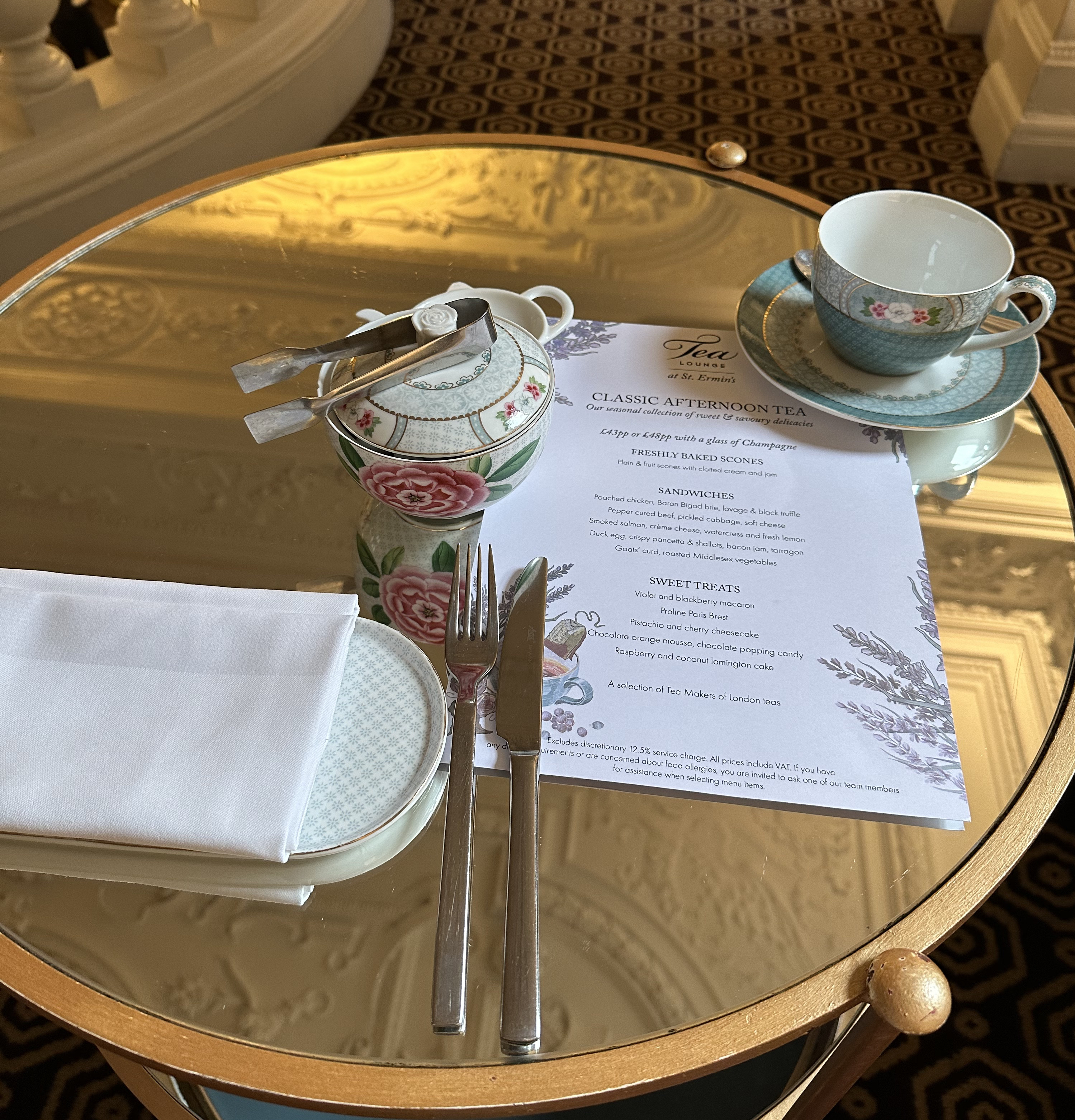 I booked a classic afternoon tea experience at the Tea Lounge at St. Ermin’s and was impressed with the menu, service, and experience. I would describe afternoon tea to my American friends as a meal but think in terms of finger food. The menu consisted of sandwiches, sweet treats, freshly baked scones, and, of course, tea. I chose the English breakfast tea, a classic choice, with sugar and milk. The tea is served in a tea pot and you are given an hourglass timer with three options for strongly you would like your tea steeped. I perused the menu during the four minutes my tea steeped for that medium flavor. The food is served on a tower of sorts and, beginning at the bottom, the sandwiches included: