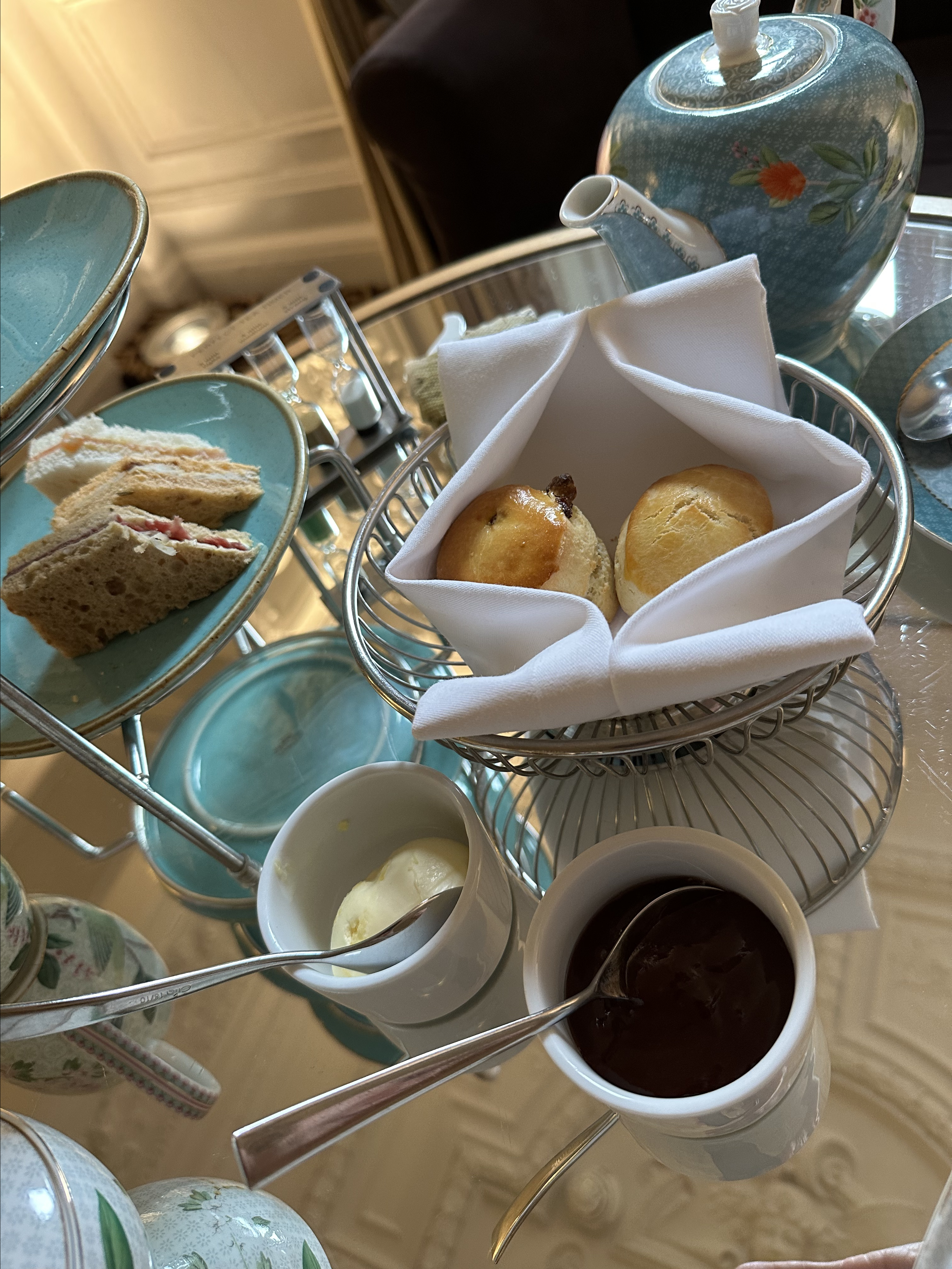 My least favorite sweet treats were the cheesecake and the mousse due to flavor on both. Again, they were not bad, they just weren’t for my palate. My absolute favorite sweet treats were the Praline Paris Brest and the raspberry and coconut lamington cake. I thoroughly enjoyed every bite of both and will work on recipes to be able to make them at home. These were heavenly, superb, delightfully lite, and wonderful. As if that wasn’t enough food, freshly baked plain and fruit scones were also served with clotted cream and jam. I am stepping into the muck here with a hotly debated topic but I opted for cream then jam. Clotted cream is something difficult to explain. Think like a very soft cheese almost. It is thick yet spreadable, sweet yet tart. The combination of the clotted cream and the jam were a delightfully enjoyable end to afternoon tea. The service was impeccable and my waitress was kind and helpful in her tea recommendations.
