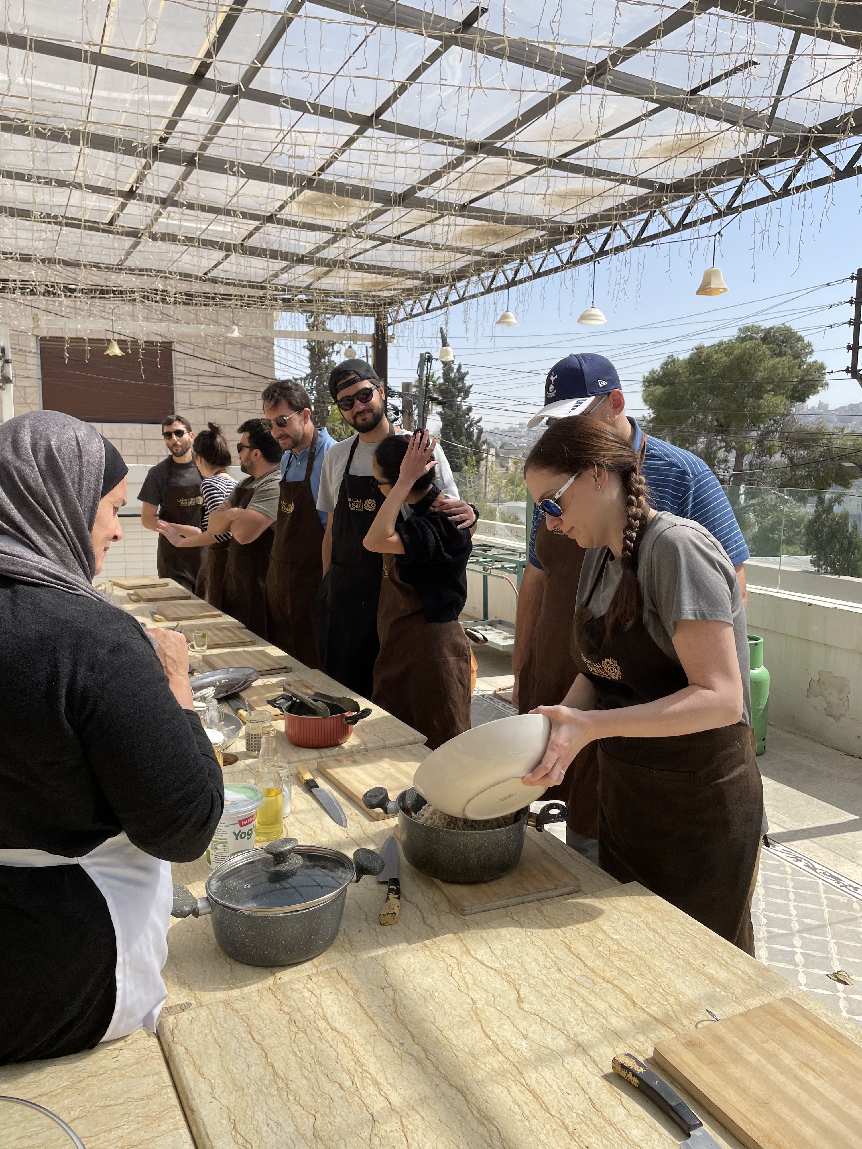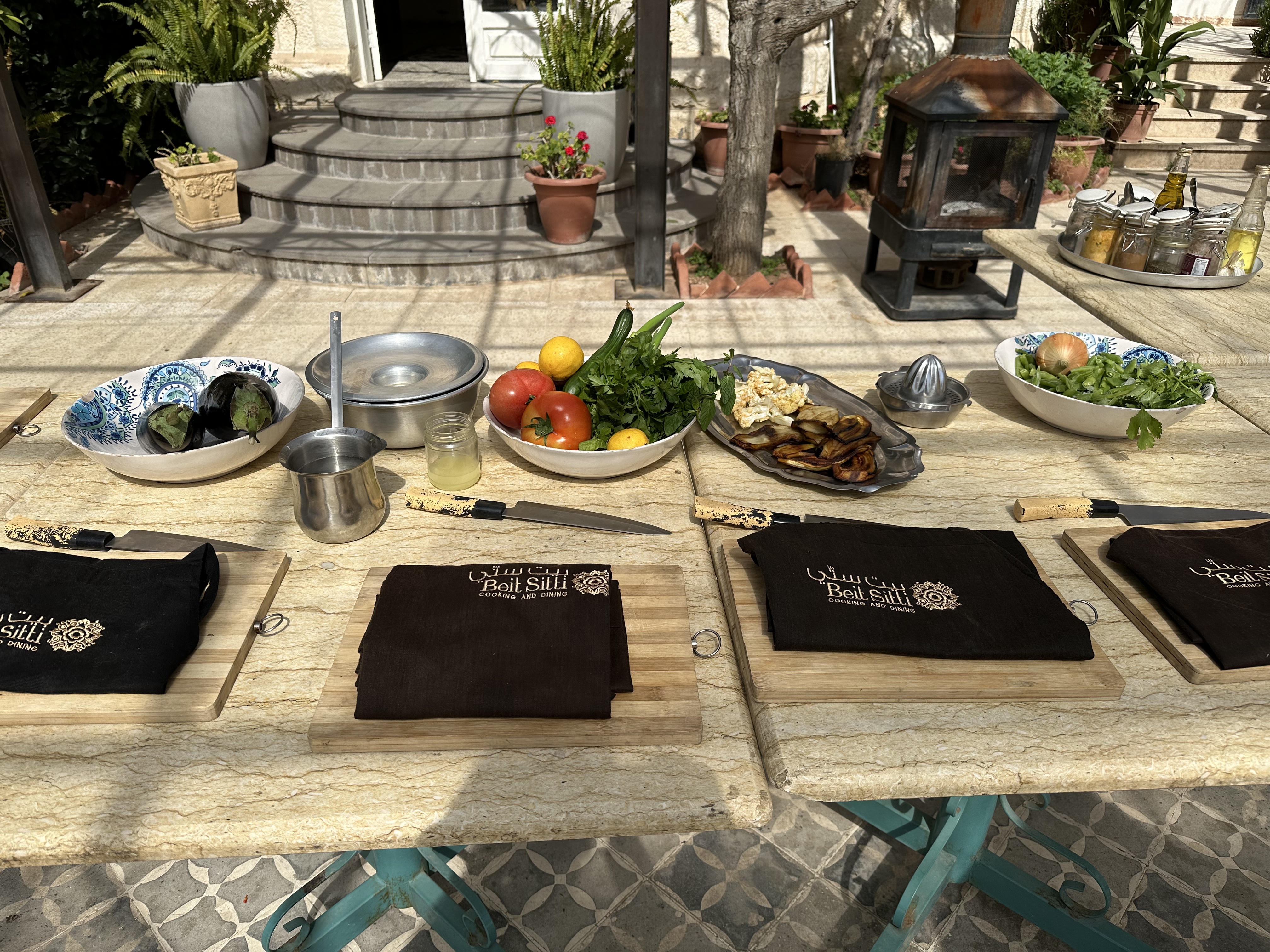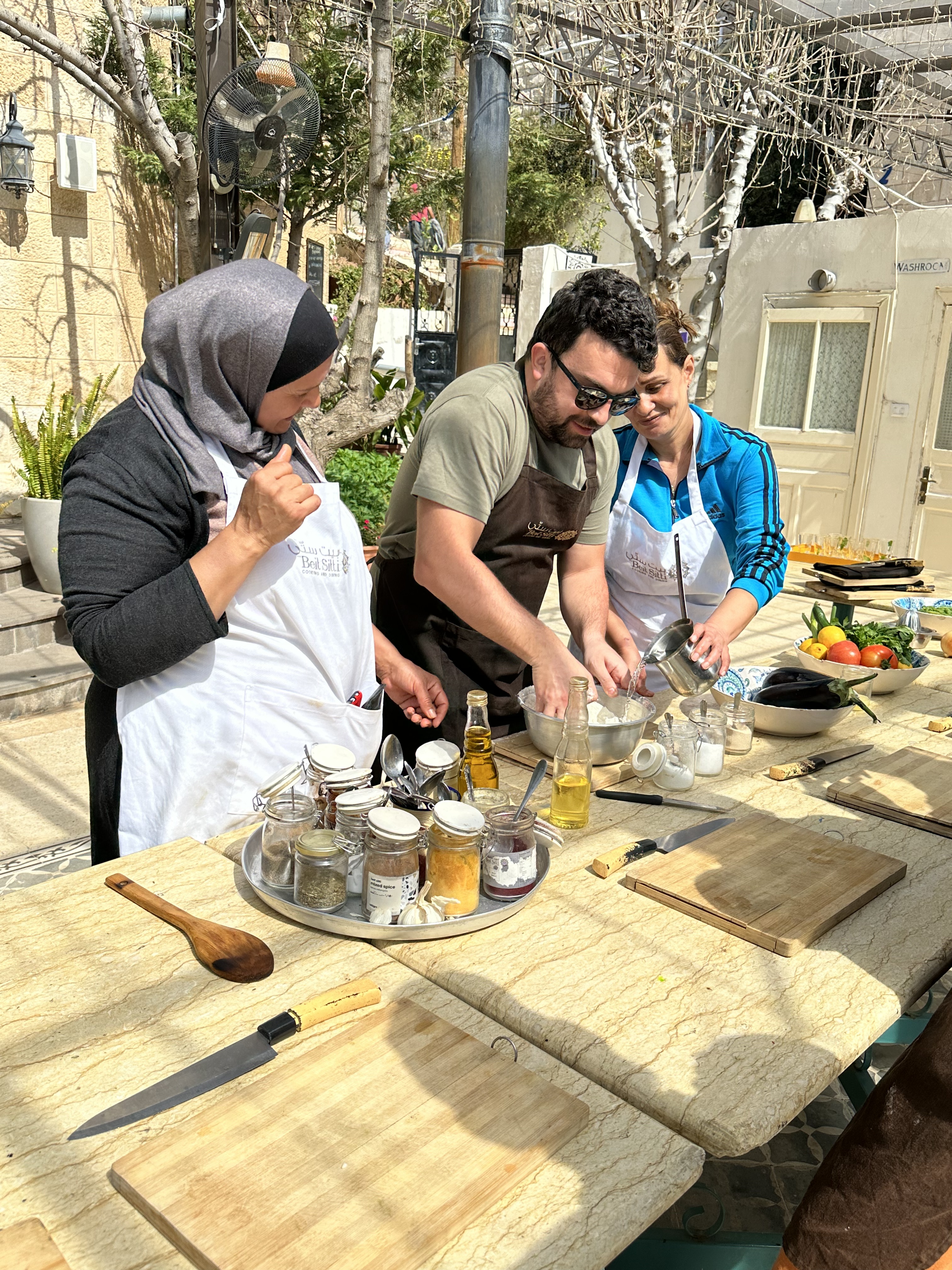 We left about 11:30am for a cooking class at Beit Sitti which offers authentic Arabic cooking. It was a lovely day, sunny with a steady breeze, and we were set up on the terrace for the class. The covered terrace was surrounded by herbs and orange trees in addition to the cooking equipment which is primarily fueled by propane. Each person participated in the preparation of the meal and then we sat down to eat family style.
