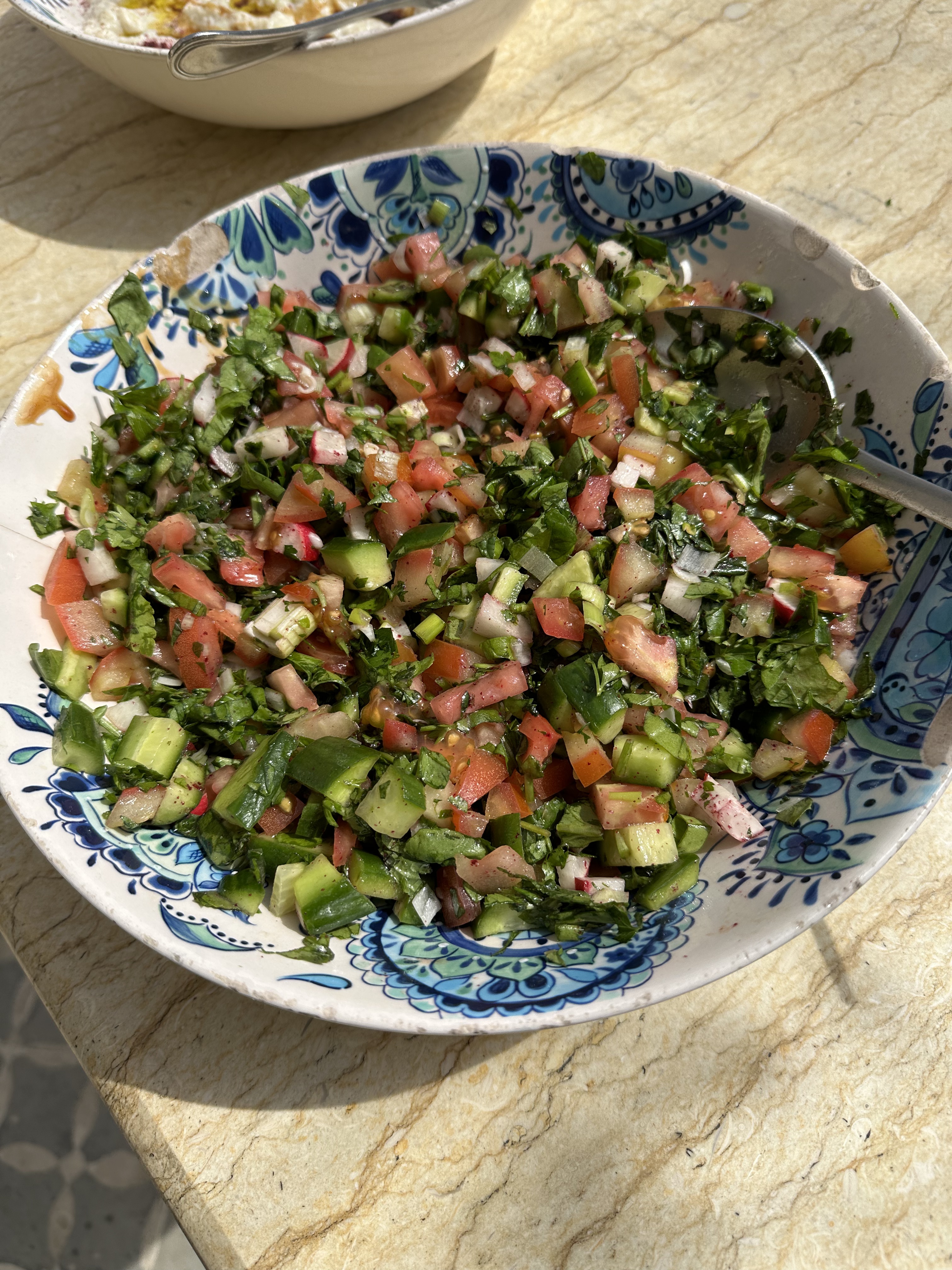 - A farmers salad which included tomatoes, cucumbers, mint, parsley, onion, sumac, and pomegranate molasses.