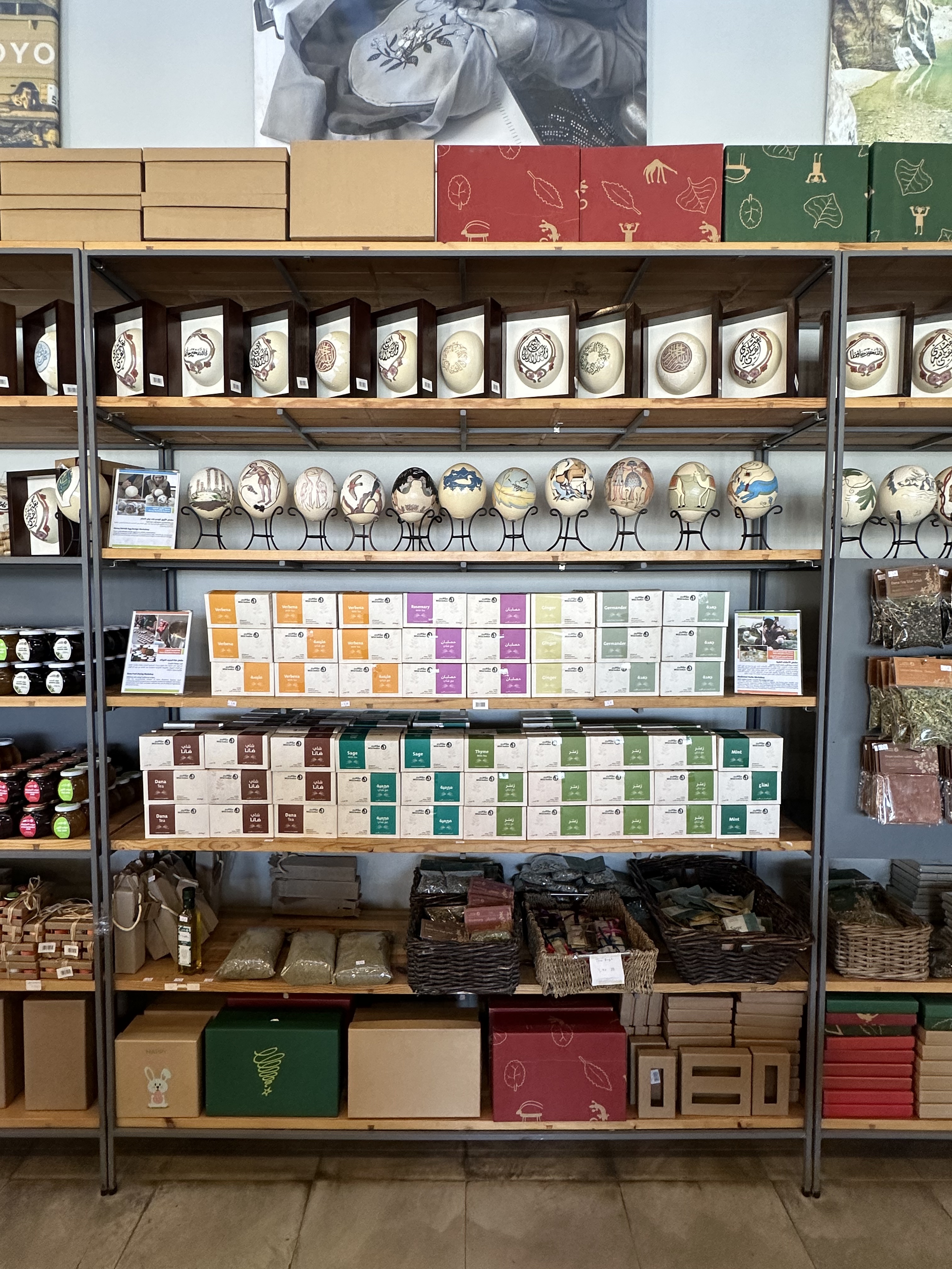 Rainbow Street is a popular area with tons of shops and restaurants. We spent a little bit of time a couple streets over in shops like Urdon Shop, Wild Jordan, and Trinitae. Urdon Shop and Wild Jordan offer a variety of items, everything from postcards to furniture, all made in Jordan and supporting regional outreach programs. Wild Jordan has ostrich eggs which are beautifully hand painted in a variety of prints, patterns, and holiday themes. There are even half eggs which are set in a shadow box type frame. It was an unexpected opportunity to see how thick an ostrich egg is … I’m estimating 1/8″ at least. I was nervous to try to get one home but the shop will pack them in bubble wrap and a box so I think it would be okay to travel with in hand/carry-on luggage. Trinitae Soap offers a variety of specialty soaps and lotions which smell amazing and use Dead Sea ingredients.