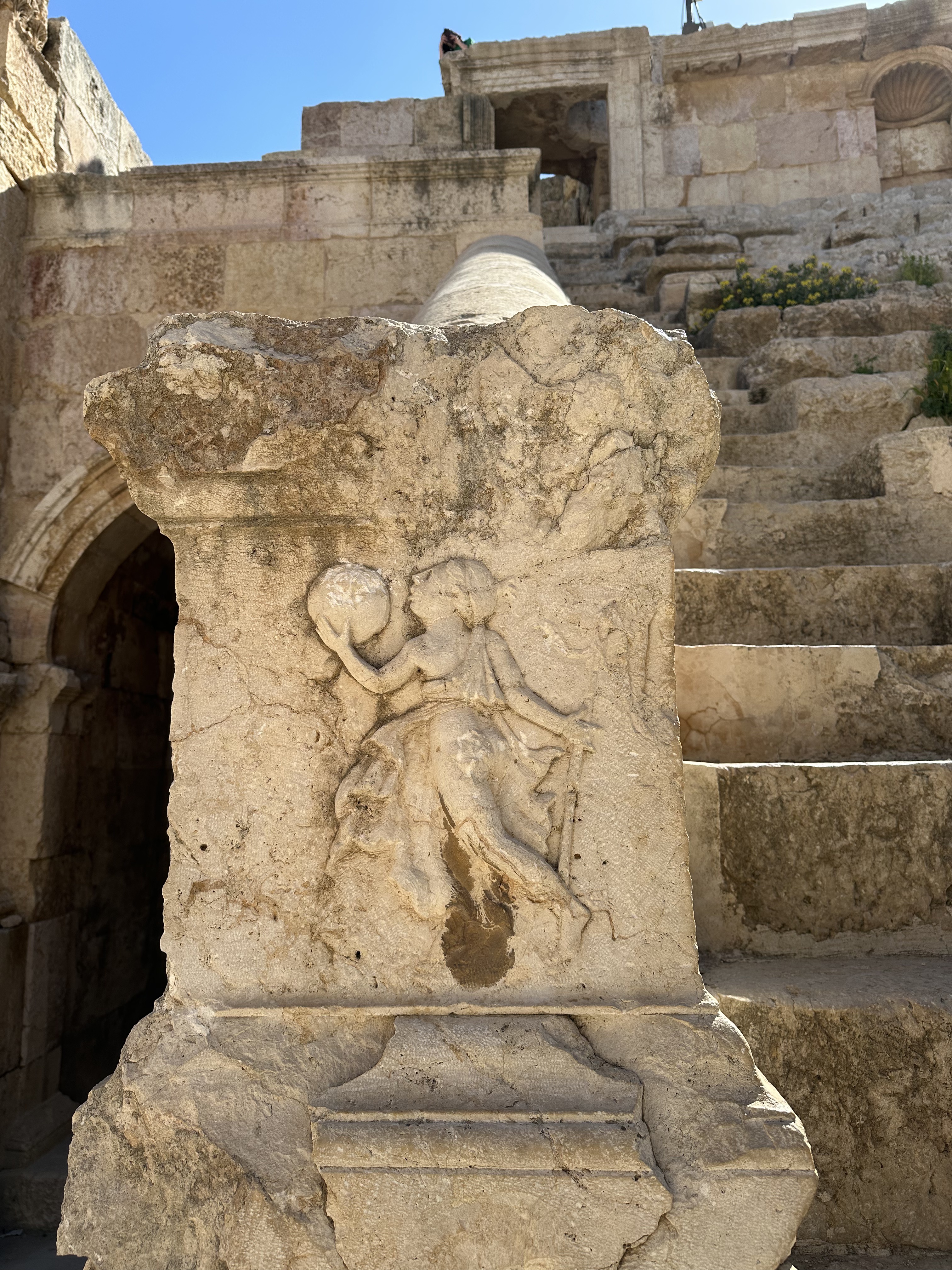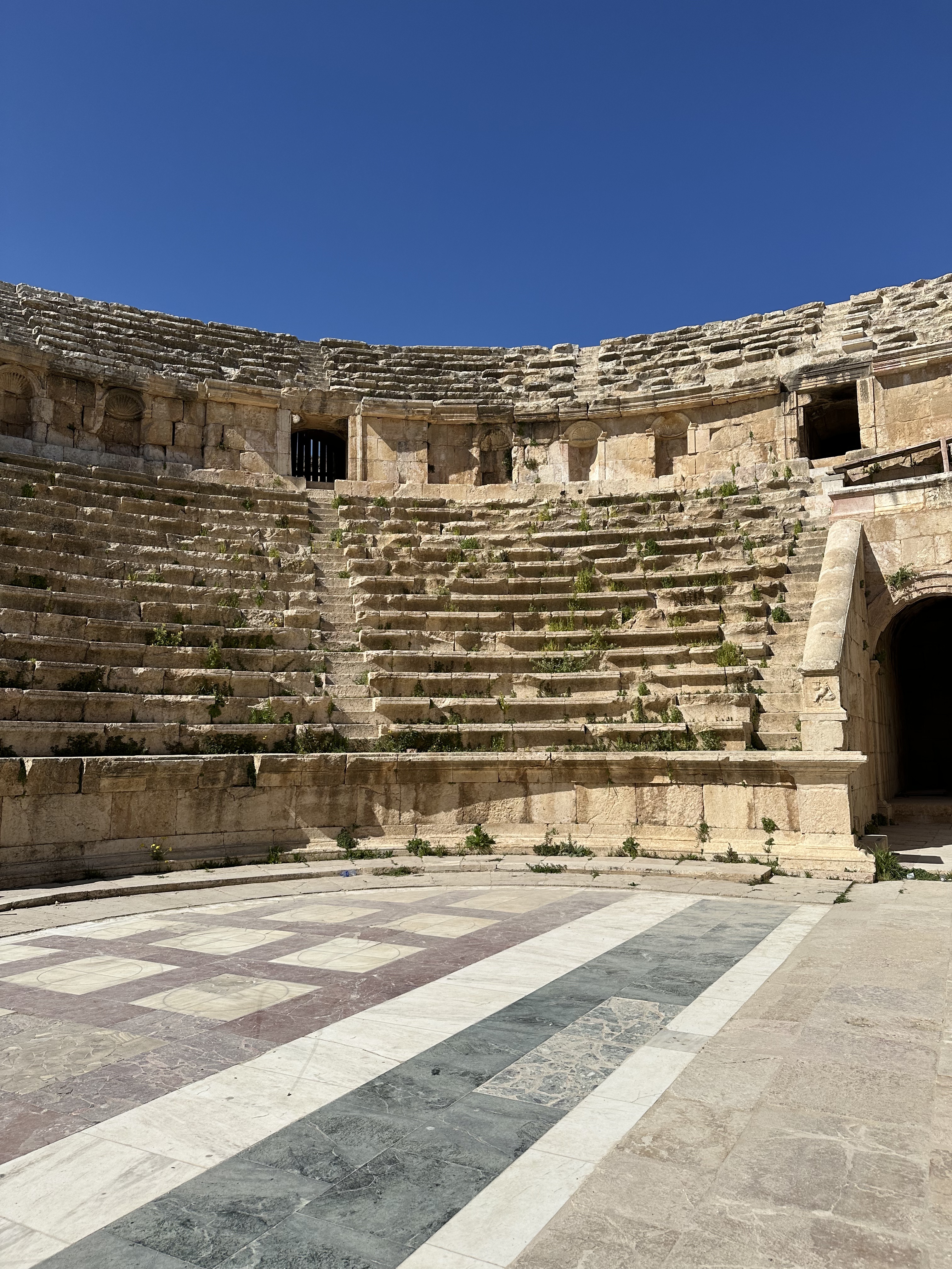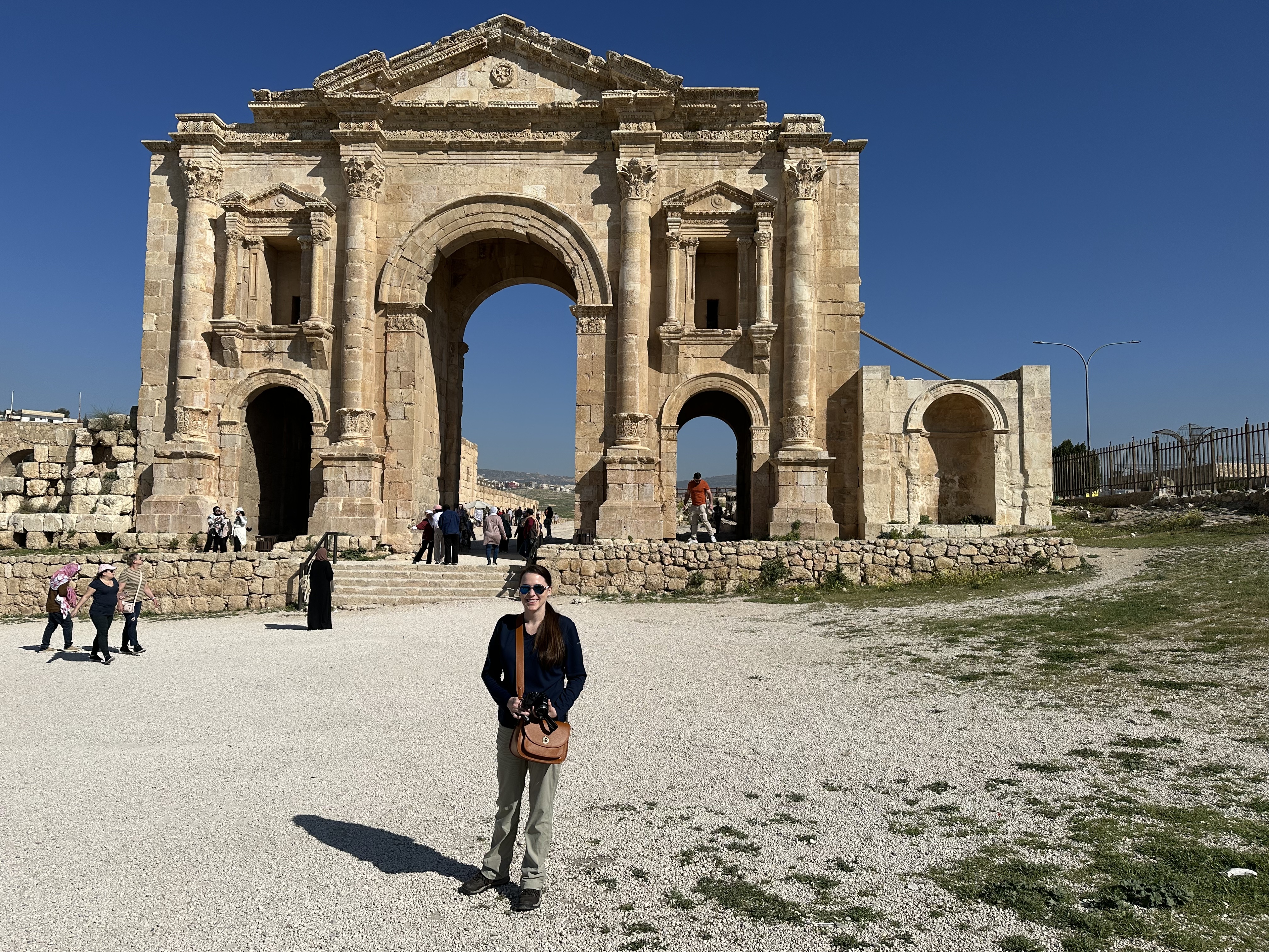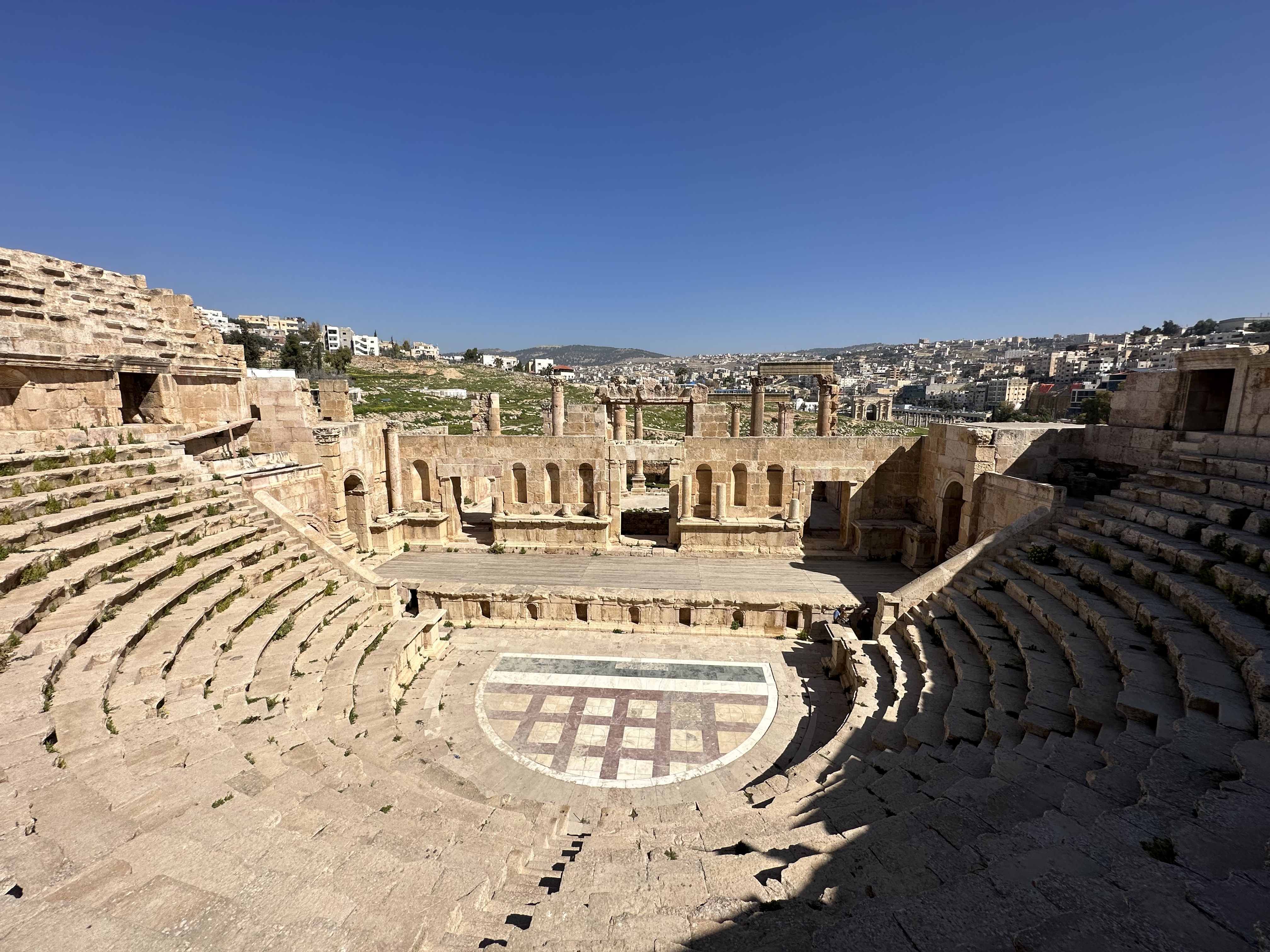 Today’s Jerash is a great area to walk and explore; be sure to wear comfortable, supportive shoes and take sunscreen, a hat, and water. You have to walk through a market area to actually enter the Roman Ruins so be prepared for the stand owners to try to persuade you to view their wares. I found the vendors to be very vocal but not rude or overly pushy. A firm but polite “no” was generally respected and the quips were funny in the few cases where the vendor wanted to have the last word. Enter the ruins by Hadrian’s Arch where you get a sense of the grandeur of ancient Rome. At approximately 42 feet or 4 stories tall, Hadrian’s Arch was built to welcome Emperor Hadrian during a visit to the city. (Still waiting on someone to build a monument to welcome me!) Beyond Hadrian’s Arch is the hippodrome, the ancient sports field. Hosting athletic competitions and chariot races, the hippodrome would have been able to accommodate up to 15,000 people. The amount of seating visible today is a bit misleading as it represents approximately 1/30th of the full capacity but it is still an interesting stop and you can easily imagine the loop chariot racers would follow. Pass through the south gate in route to the forum and cardo maximus. The columns continue to draw visitors in for photos, picnics, or simply a shady spot to take in the view. From the forum, follow the cardo maximus, the main thoroughfare, to the right to take in the nymphaeum, propylaeum, and north gate. Veer off the cardo maximus on the return to see the north theatre, Temple of Artemis, south theatre, and finish with the Temple of Zeus. Each of these is worth at least a few minutes to take in the view and appreciate Roman architecture.