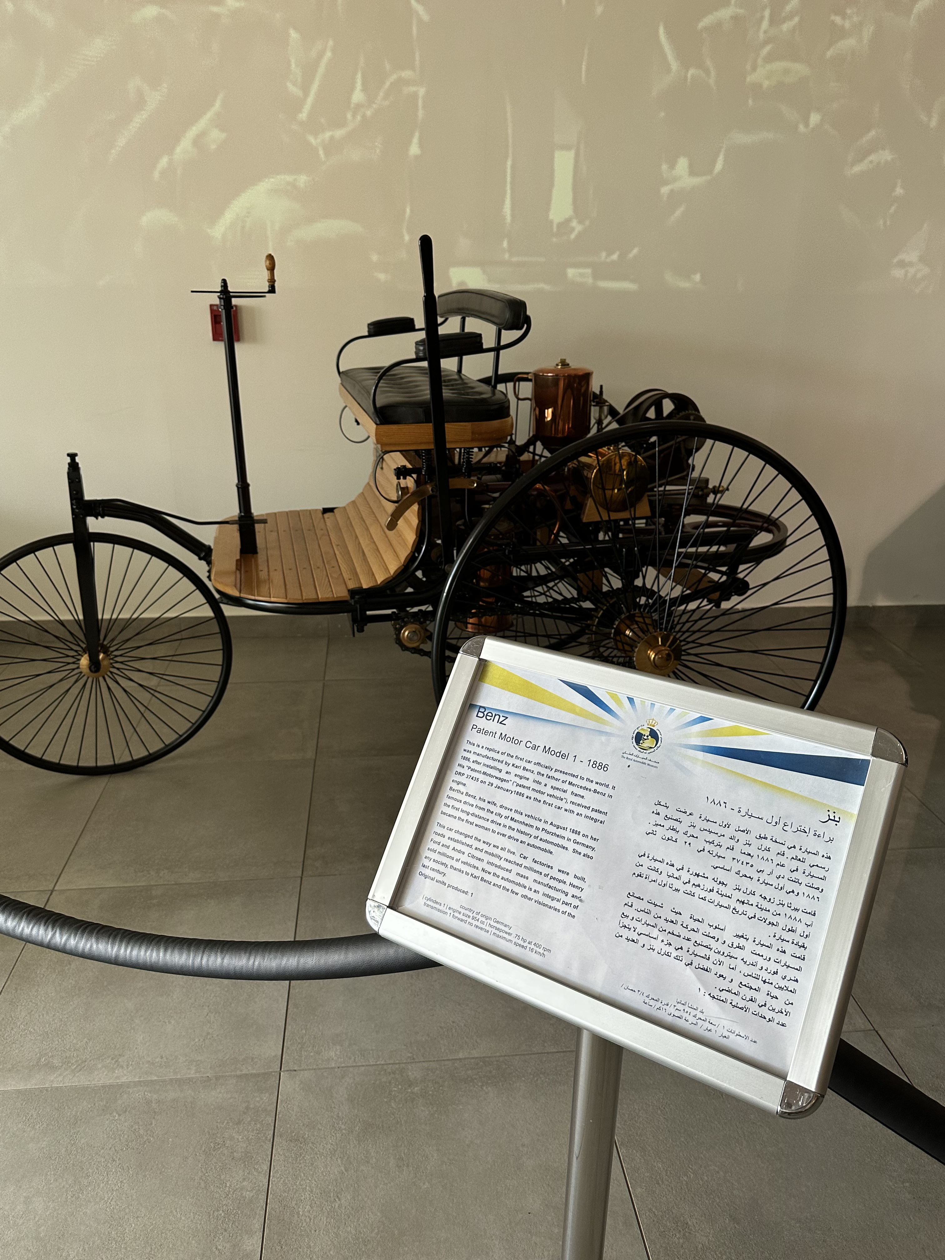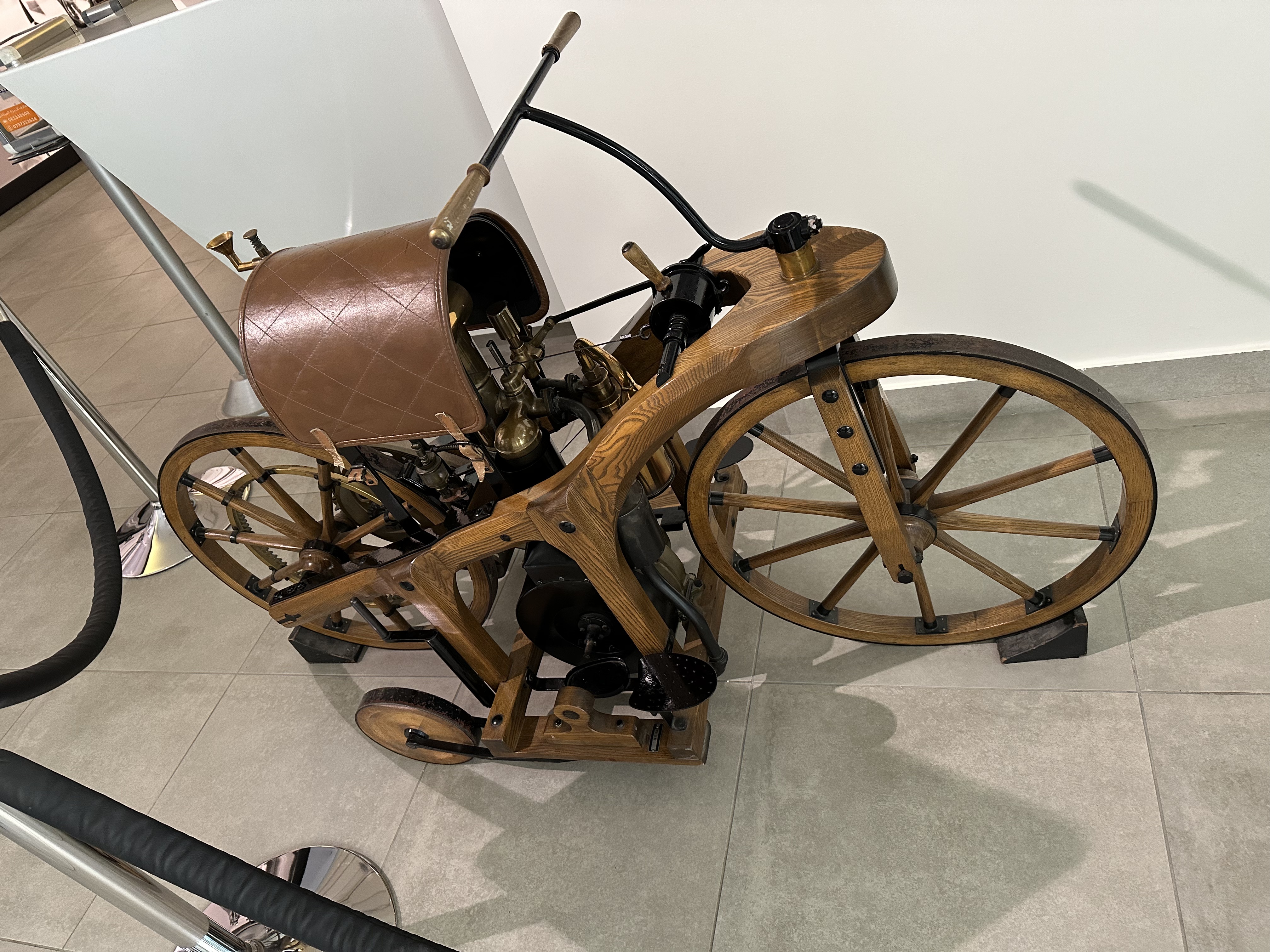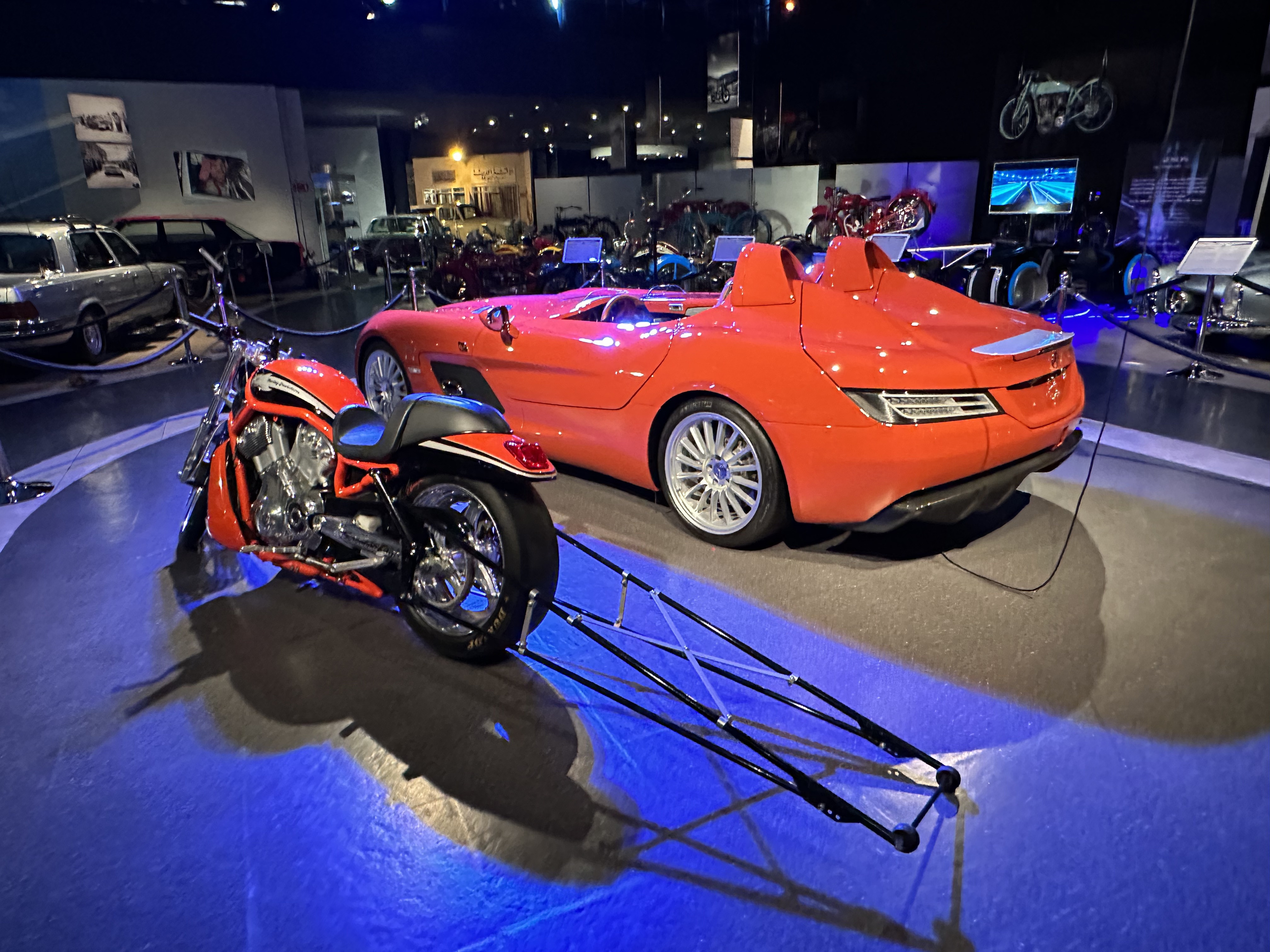 Vehicles on display include a range of cars from 1950s classic models to modern day sports cars. The Daimler experimental motorcycle (1885), the first motorcycle prototype in the world, and a replica of the Benz patent motor car (1886), the first car officially presented to the world, are both on display at the museum. These prototypes are vastly different from their modern counterparts in both form and function. Interestingly, Daimler and Benz worked near one another though they never met. Their respective companies would remain competitors until a merger in 1926 to form the company known today as Mercedes-Benz.