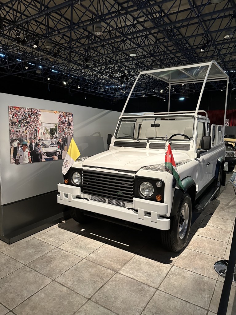 I enjoyed the Land Rover Defender on display which was prepared for King Hussein on several cross-country visits. The same vehicle was prepared for Pope Francis’ 2014 visit to Jordan and Palestine and is shown with the Vatican and Jordanian flags side by side. I appreciate the reuse and repurposing of a completely functional vehicle to fulfill different needs.