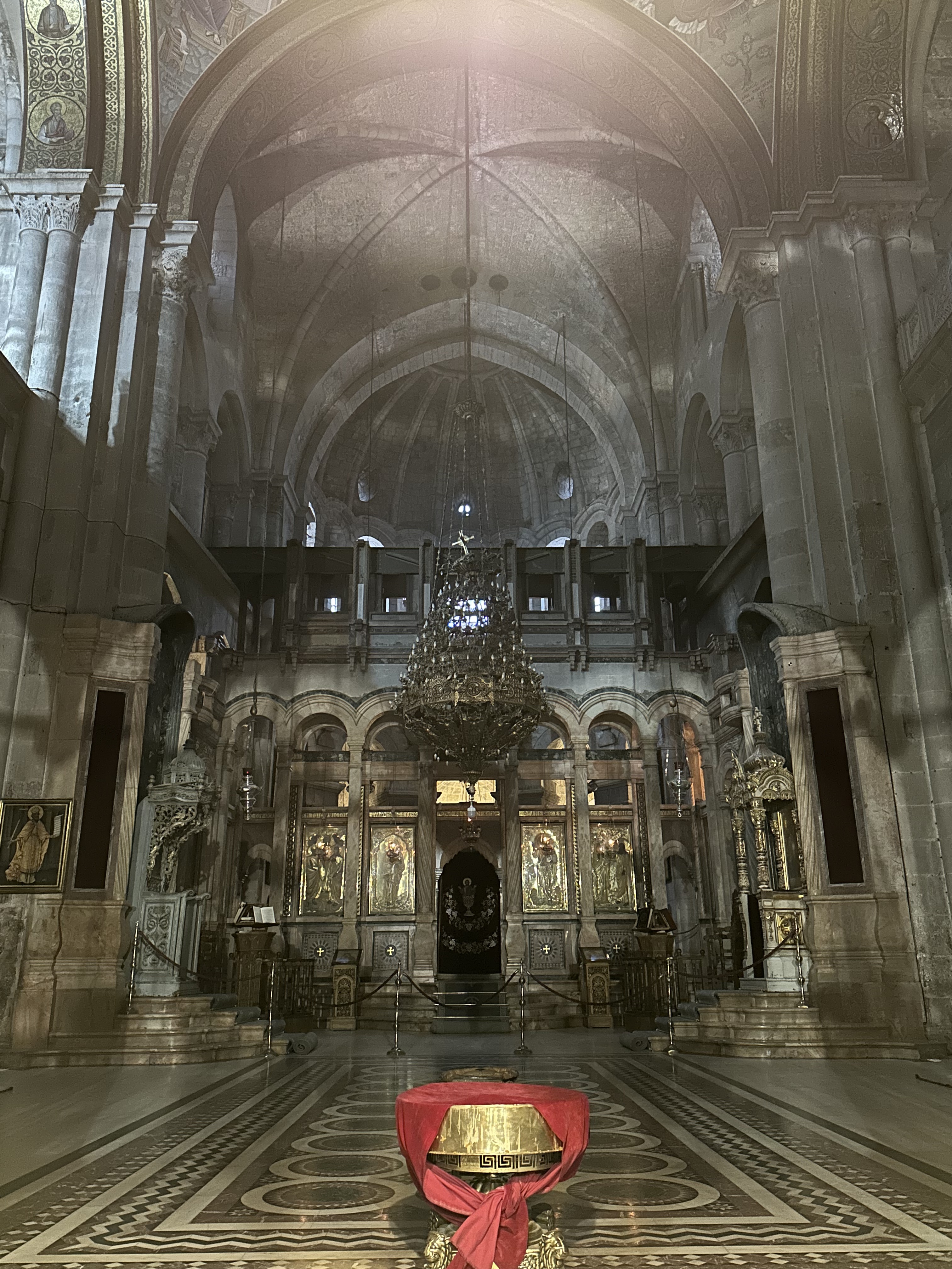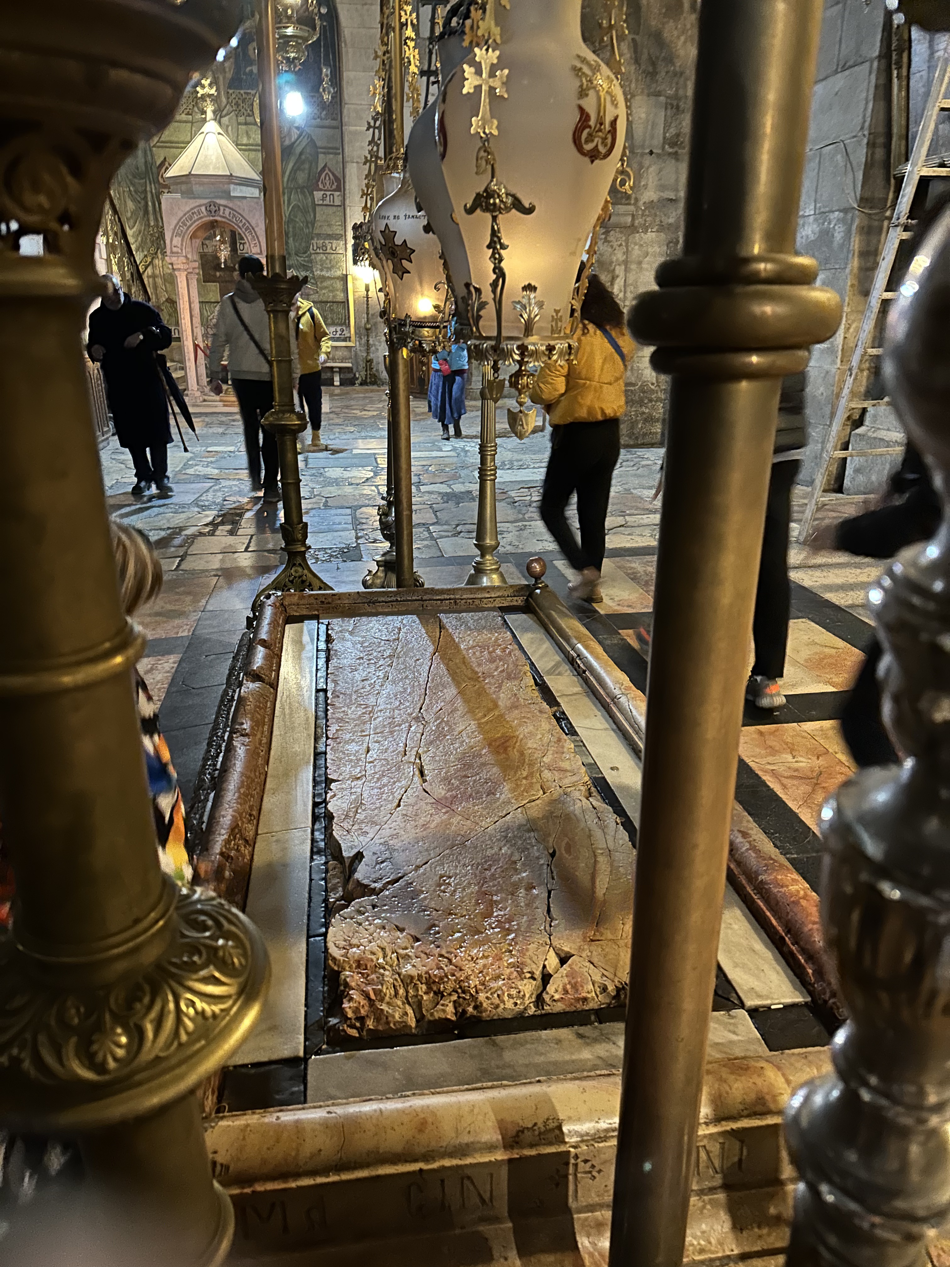 Personally, I found the Church of the Holy Sepulchre to be lavishly adorned and too full of tourists who showed little regard for their fellow travelers. I expected visitors of one of Christianity’s holiest sites to behave in a more Christian manner with patience and basic human dignity. I am deeply saddened and disappointed with what I saw and experienced. There were massive tour groups pushing their way to the front of the line, no one kept a proper queue, people pushed one another aside and to the floor, and, worst of all, no one helped those who had been pushed down back to their feet. I was pushed, pulled, and pinched in turns. My friends and I were separated by the hoards of aggressive tourist groups. Somehow my female friend and I managed to stay together while my male friend was several yards back. A few of the men, my male friend included, formed a circle around a pregnant woman to protect her from being pushed. People forgot to practice basic kindness because they feared they would miss one of the sites. It was disappointing behavior which negatively impacted the experience of visiting the church. Since we visited near closing time, I can only imagine how intense this would have been during peak hours.