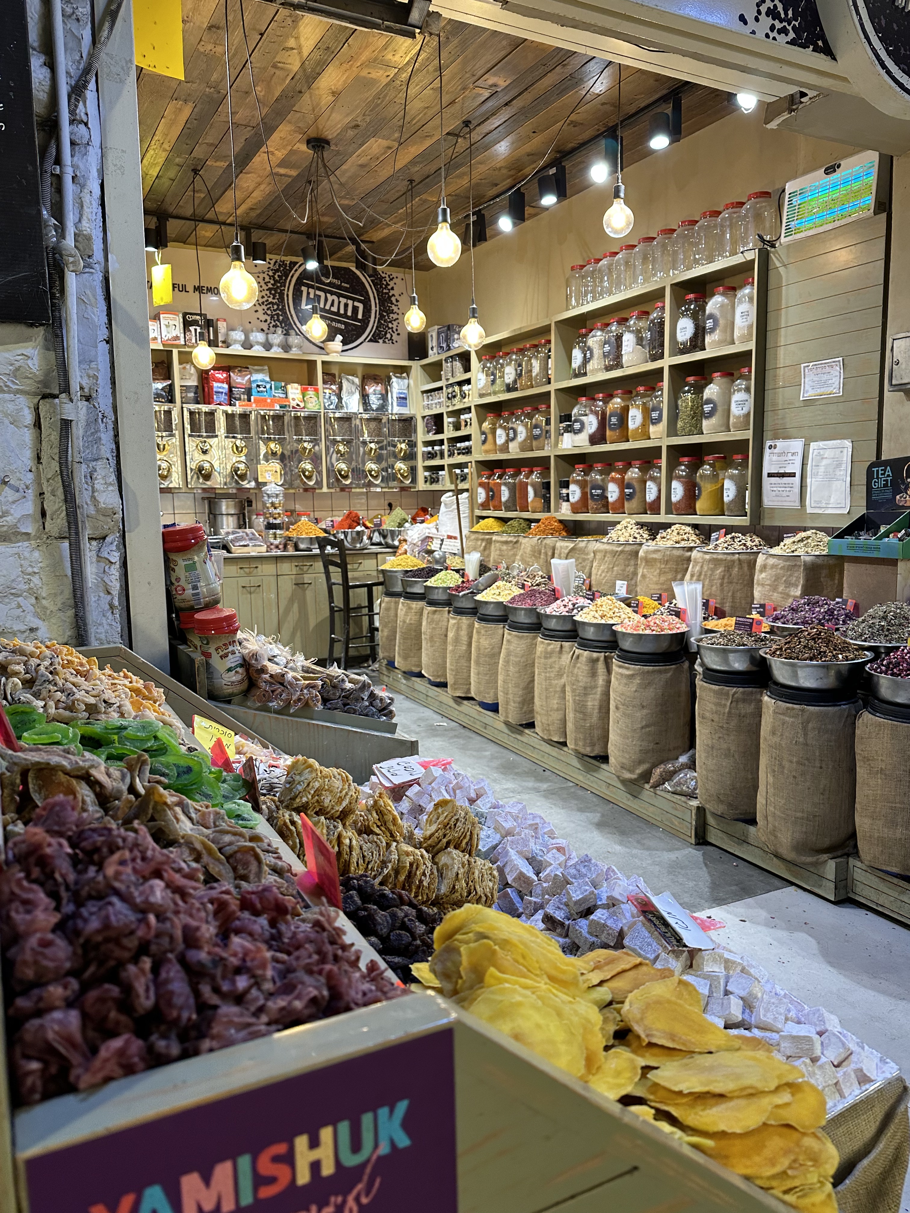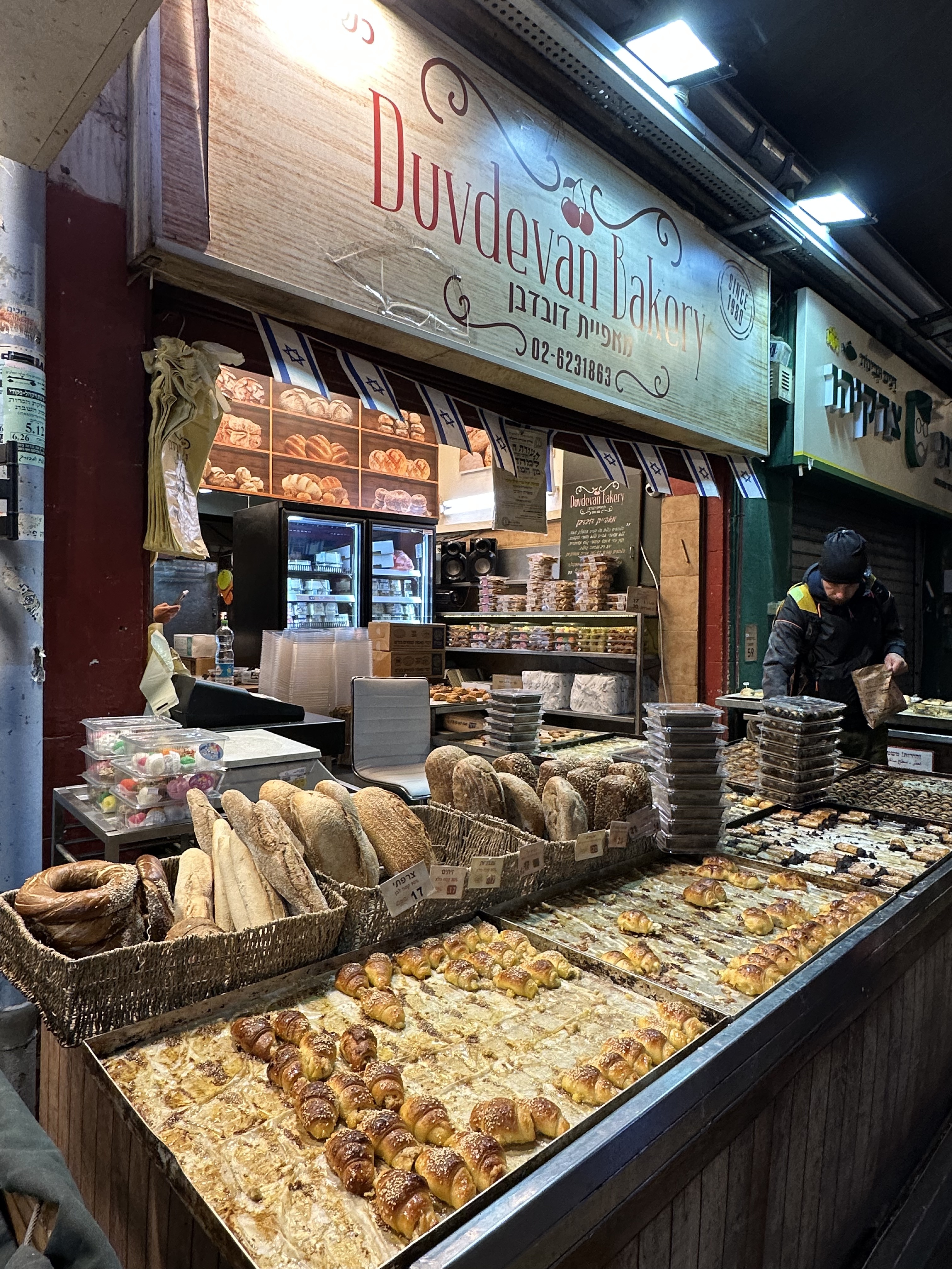 The rain continued off and on throughout the evening, including during our walk to the shuk where we ate dinner at Burgers Bar. Burgers Bar has American-style burgers, fries, and onion rings which are delightfully tasty and made to order. This location has two counter areas with a few tables at each counter and the actual kitchen area in the middle. It’s all outdoor and they had the heaters on which made sitting outside in the colder temperatures much more comfortable. We enjoyed people watching as we tucked into our food. The shuk has fruit, vegetable, meat, and pastry stalls in addition to other restaurant options. We all seemed to be craving a burger and it was a solid choice. The rain mostly stopped so we took our time walking back to the hotel and glancing at shop and store windows.
