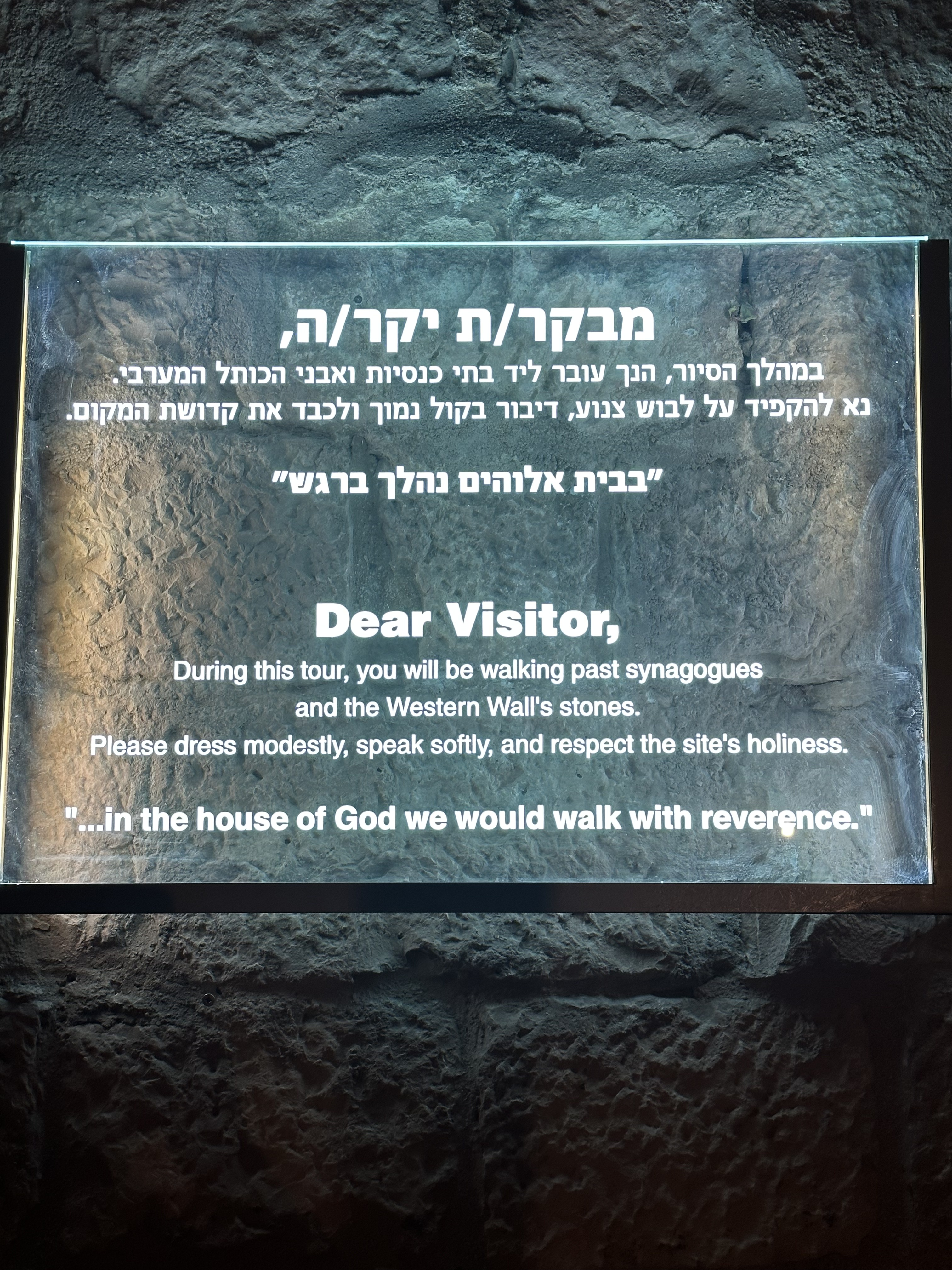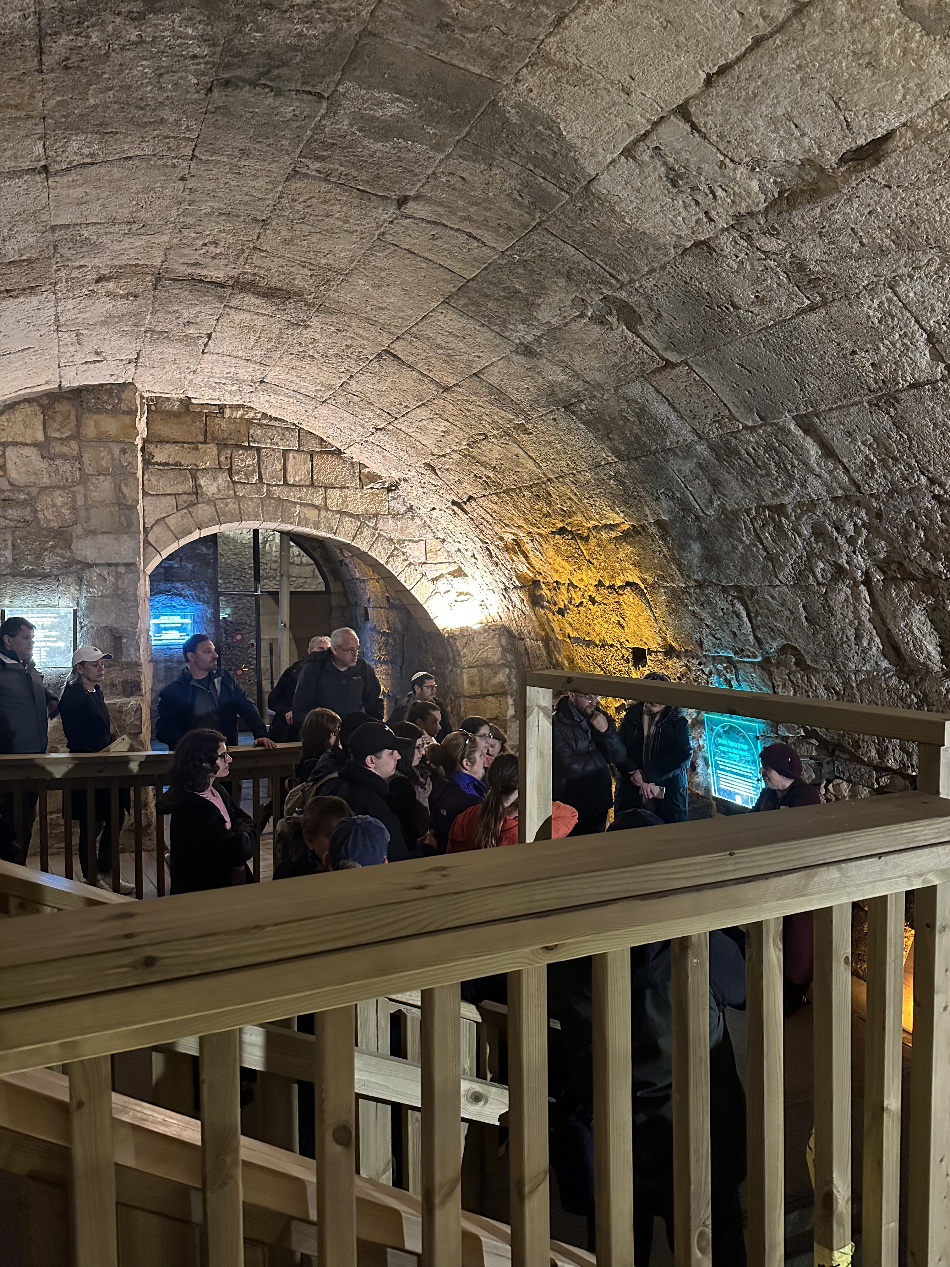 We also took a City of David tour which is an active archaeological excavation site. As such, the site changes daily with ongoing excavations. Waterproof shoes are an absolute must when trekking through the tunnels and water cisterns. Heavy rain left pools of standing water which we had to traverse and at least a few of us ended up with wet feet. This tour is through an active archaeological site and requires a moderate level of flexibility and dexterity to squeeze through confined spaces, climb ladders, and maneuver around obstacles. It’s a worthwhile tour for history and archaeological fans though it is not suitable for those with mobility impediments.