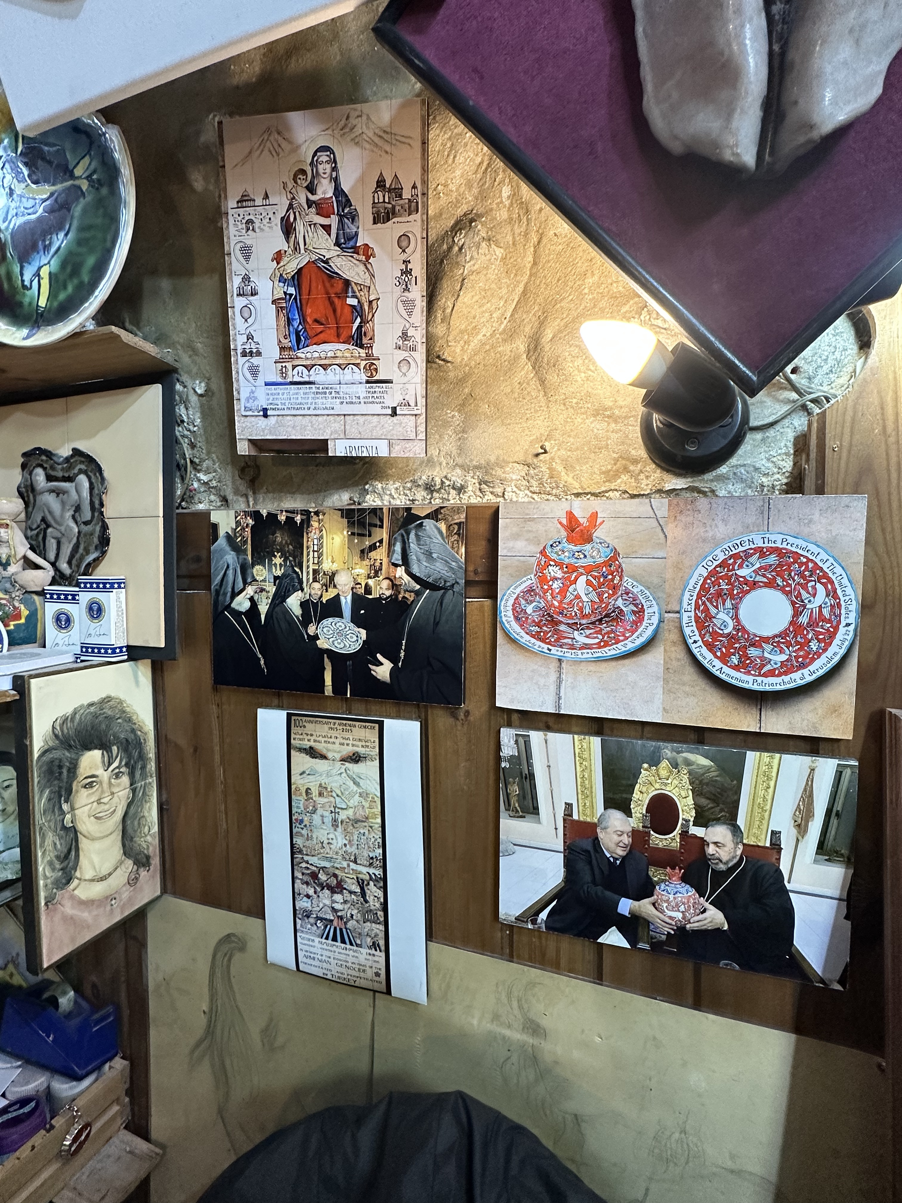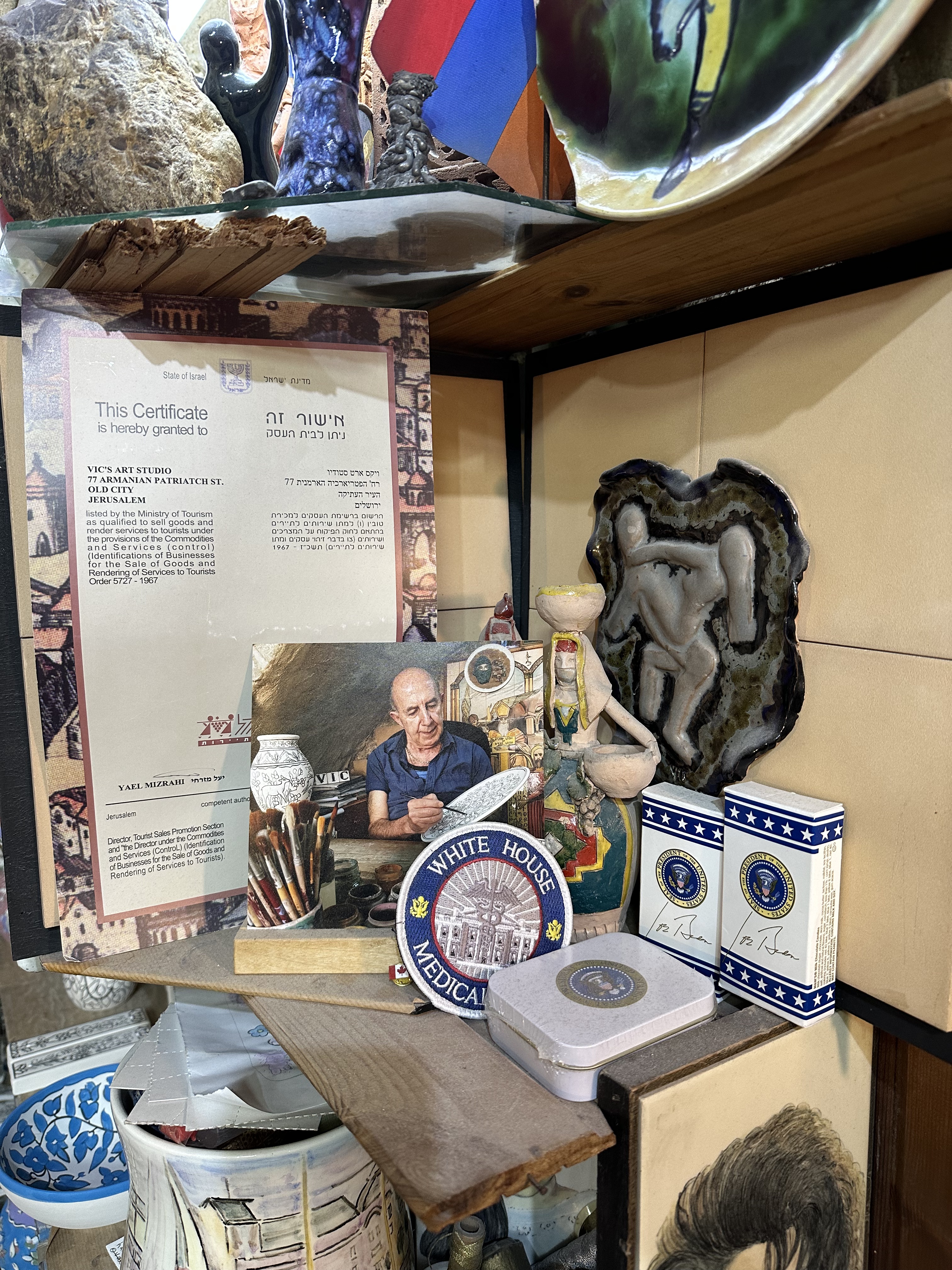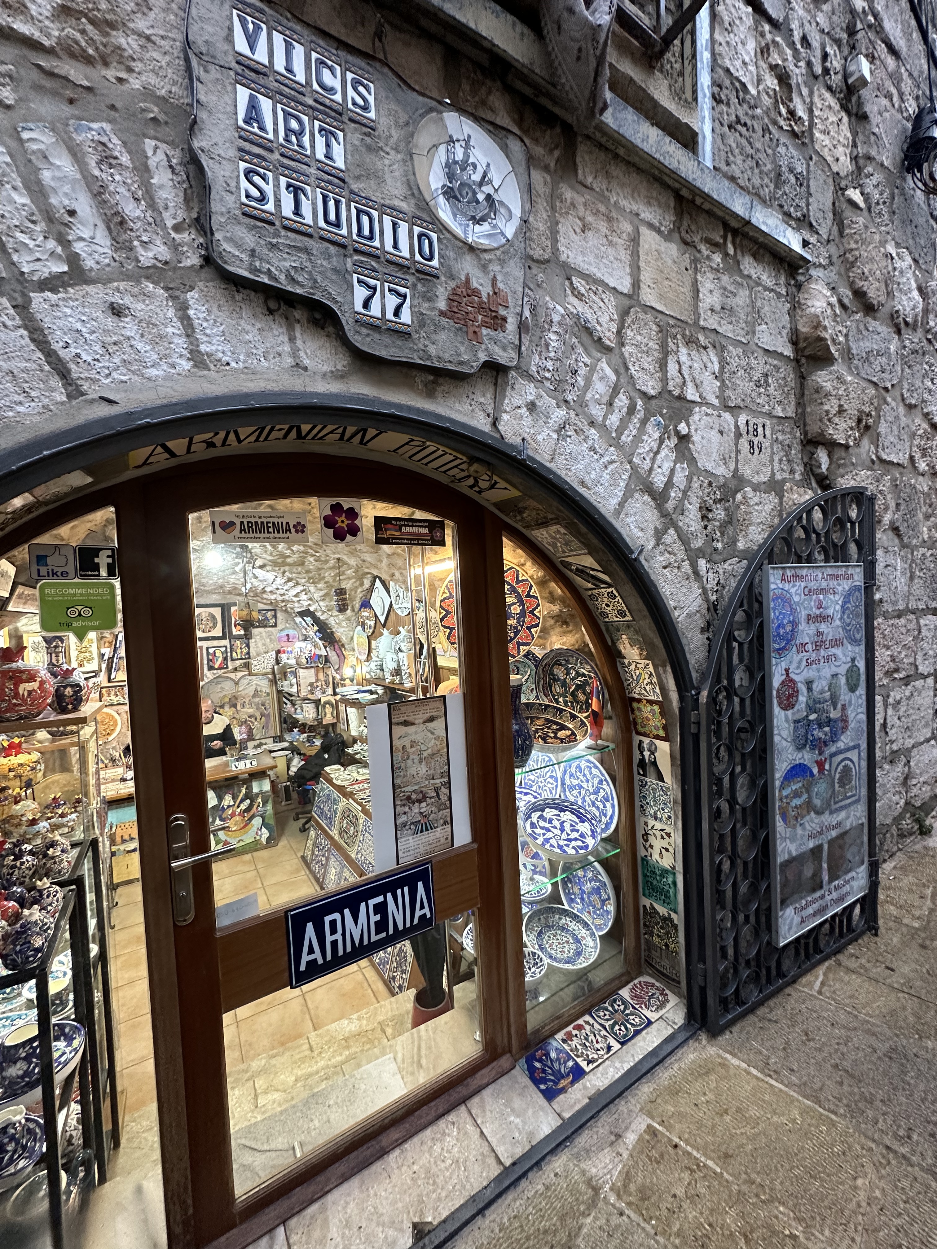 I am so glad we walked into Vic’s Art Studio in the Old City, Armenian Quarter. Established in 1975, Vic’s Art Studio is a family business started by Vic Lepejian and his son. Vic is a master in the art of handmade traditional Armenian ceramics and is known internationally for his work. Multiple heads of state have pieces from Vic’s, including President Joe Biden and King Charles III. A visit to this clean and well organized shop highlights Vic and his son working on original pieces. I was lucky enough to see Vic, his son, and his daughter-in-law working on pieces during my visit, each with their own unique style and preferences. Black and white, pastels, and vibrant reds and blues feature prominently throughout the shop. Every piece is stunningly beautiful and functional, ranging from decorative tiles to dinnerware. There is a wide range of price points, and they will do custom pieces. I regretted having relatively limited space to bring home more pieces until I learned that Vic ships internationally and is returning to international expositions post-pandemic. Hopefully I will be able to attend one of his expositions this year … or I will have to go back to Jerusalem! Check out Vic Lepejian – Genuine Armenian Ceramics and Pottery on Facebook to see some of his work.