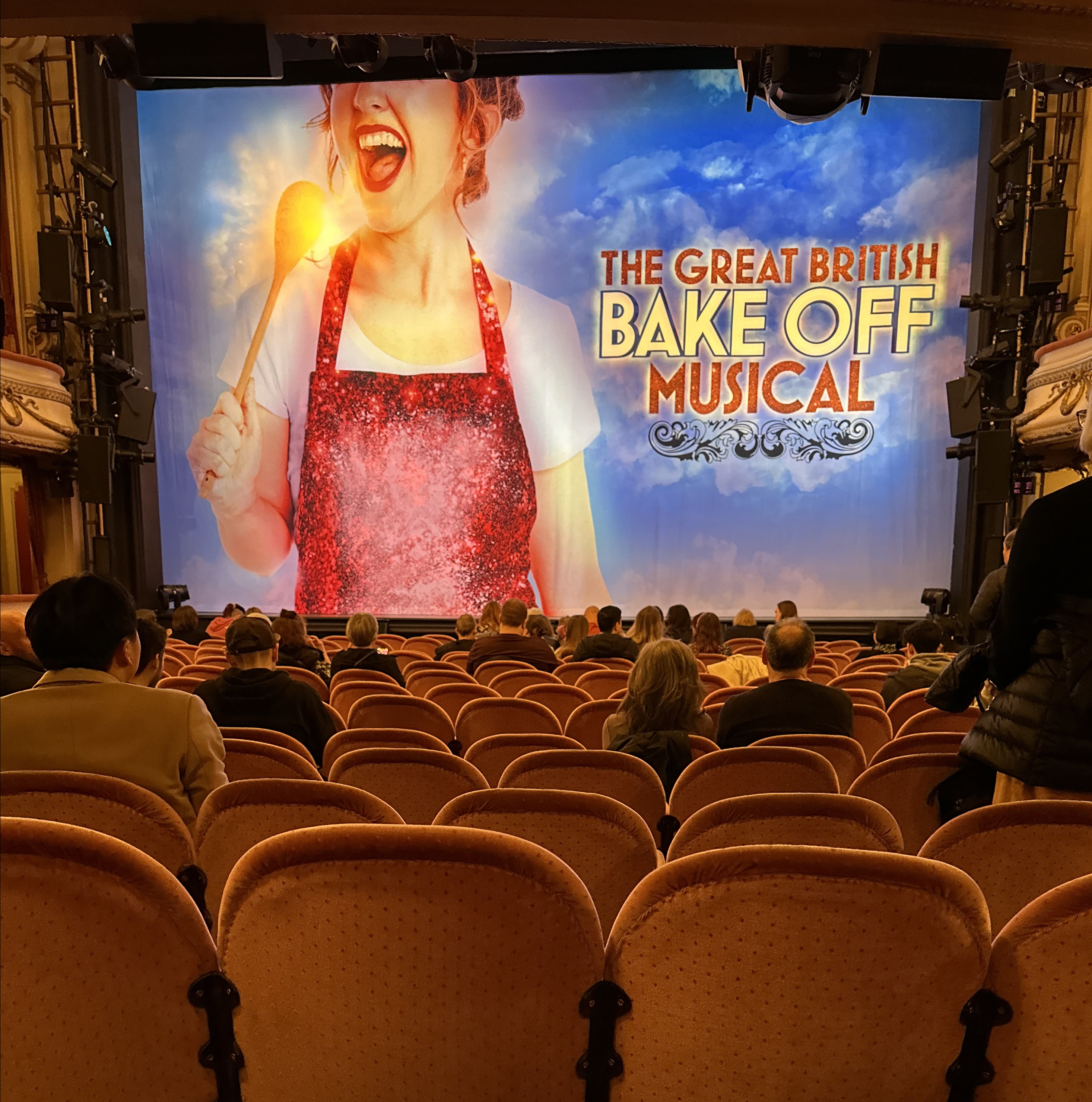 I am ecstatic to see the Great British Bake Off Musical at Noel Coward Theatre! I have been watching the Great British Bake Off series on Netflix for years and am a huge fan. Thankfully the dates aligned for me to be able to see the musical tonight! Noel Coward Theatre is lovely and only about a 10 minute walk from the hotel. The GBBO Musical is a limited time show and is very popular with the Brits so the queue was forming a full 45 minutes before the show began. The doors opened 30 minutes before the show started and I had time to stop at the merchandise counter and bar before finding my seat. I am seated in stall row P seat 13. The topmost portion of the screen is slightly obstructed but the stage view is un-obstructed perfection.