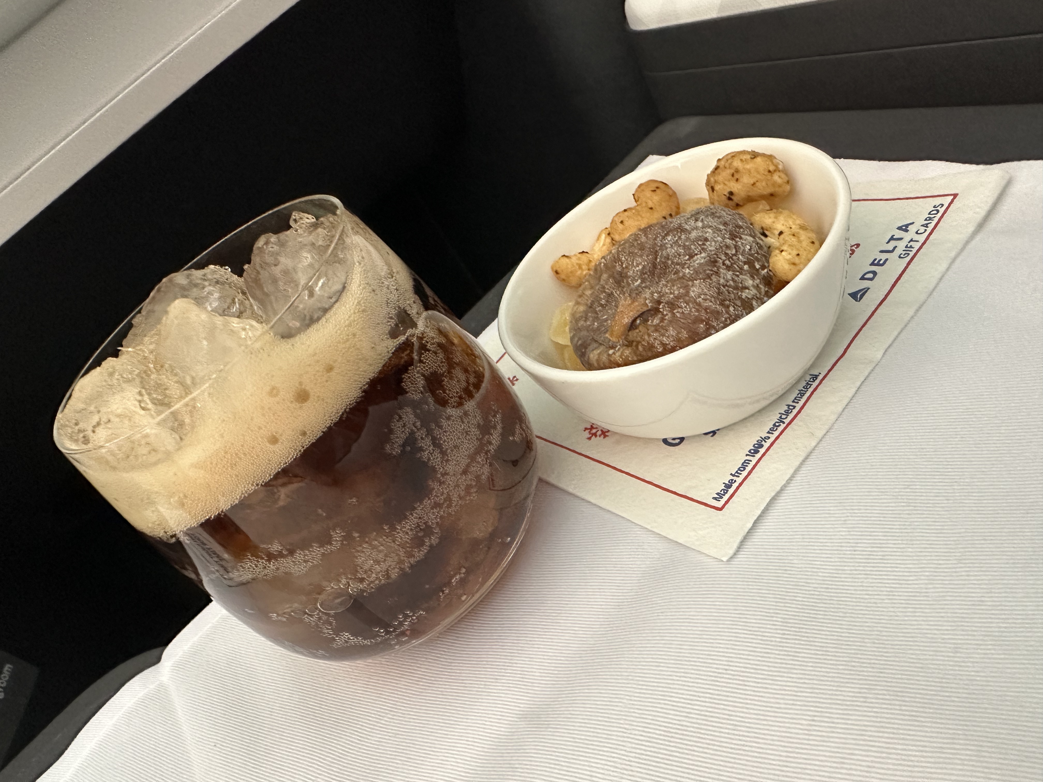 I had a surprise at boarding with a free upgrade to Delta One! The Delta One upgrade comes with a lay-flat bed, full size pillow and blanket, slippers, headphones, amenities kit, a larger entertainment display screen, additional storage at the seat, and a ton of legroom. Flight attendants offered mimosas for the welcome drink and it was a lovely little celebratory drink to kick off the long flight. The in-flight meal for this flight includes a date and nut hors d’oeuvre, small side salad, soup, and ciabatta roll. I chose the chicken curry entrée and it was okay though not my favorite. Soon I settled in to watch a movie and enjoy a nap. We also had a lite meal before landing and I chose the afternoon tea option which includes two finger sandwiches, scones, and two sweet pastries. This meal I enjoyed and it reminded me of my afternoon tea experience at St. Ermin’s.