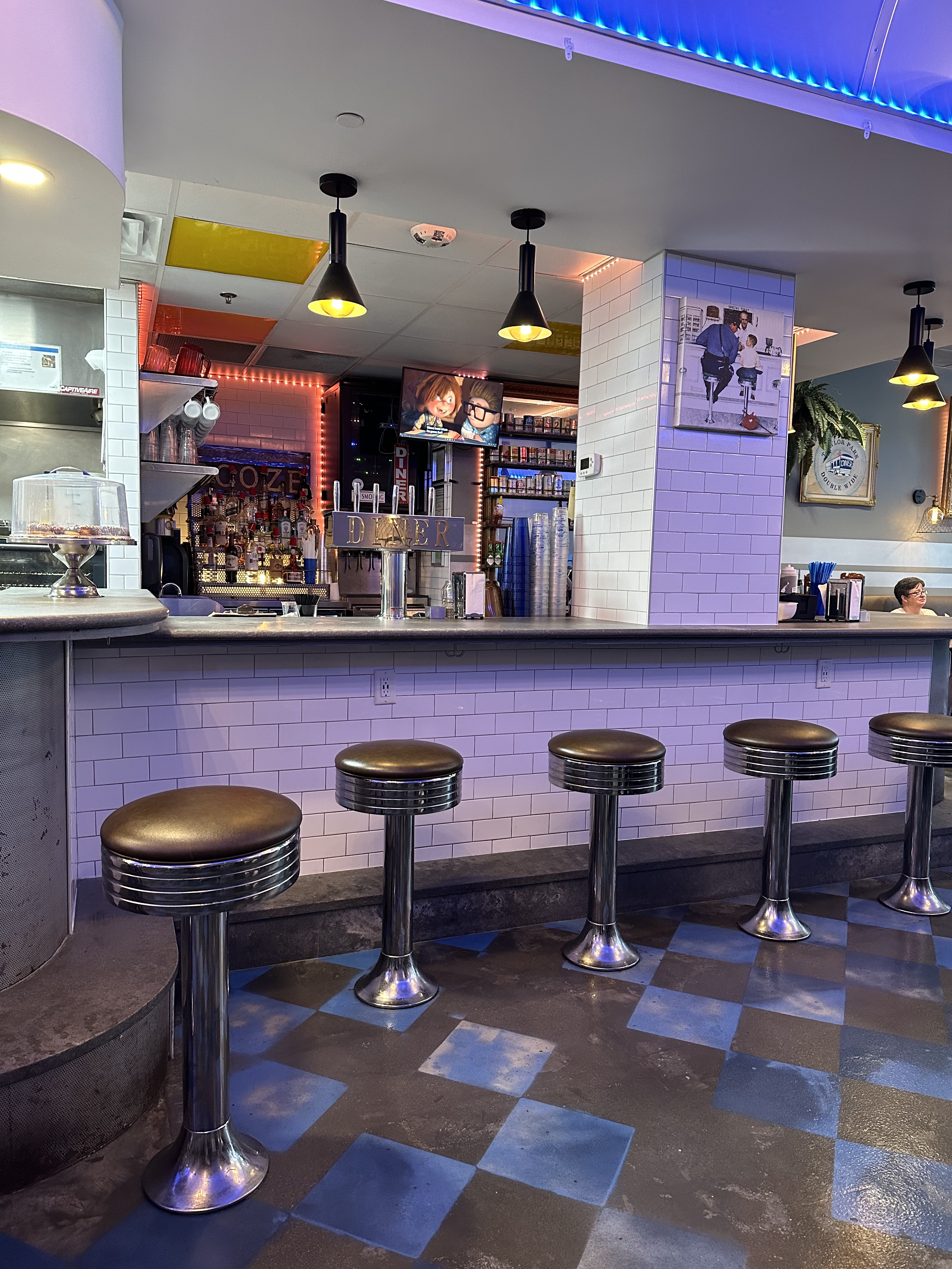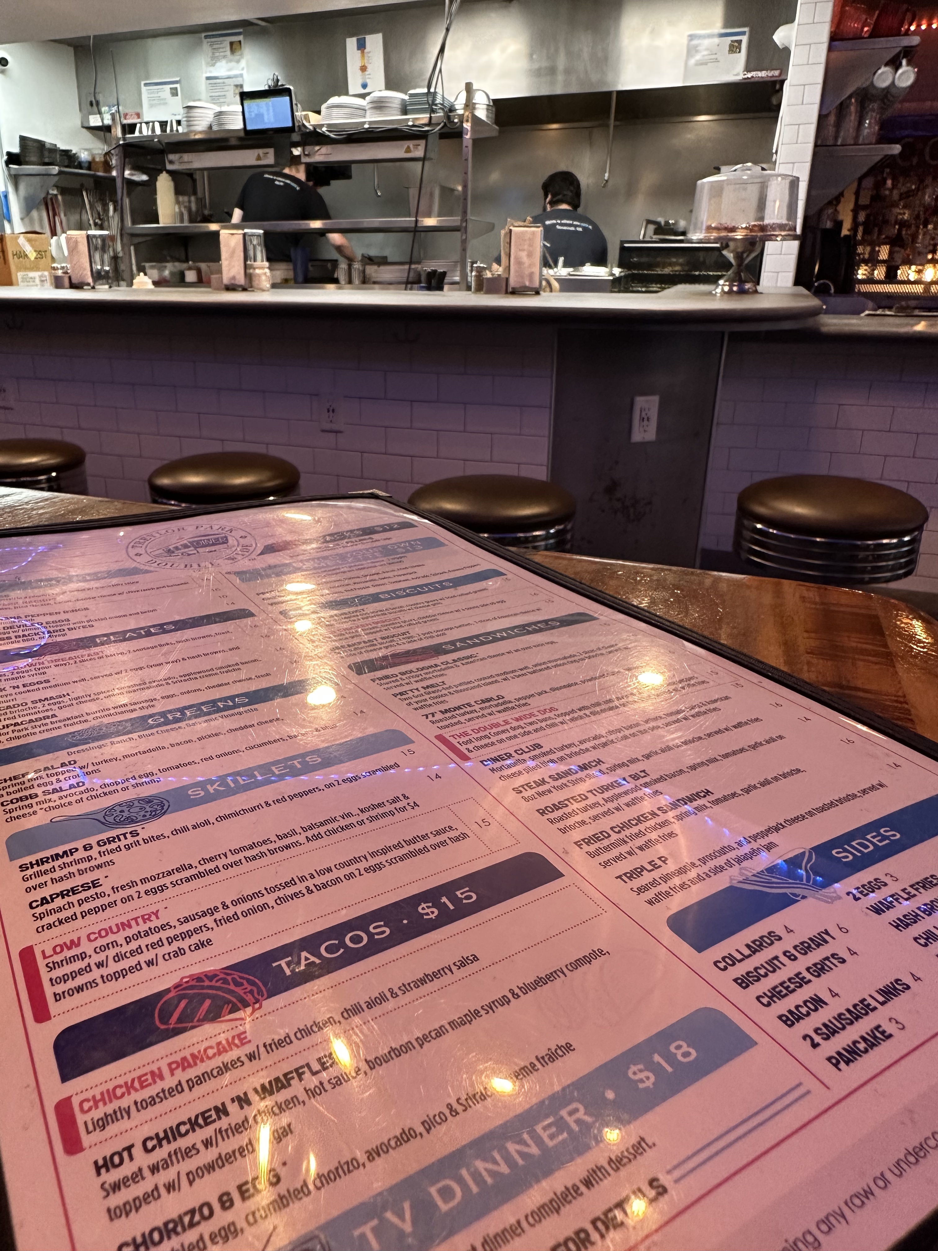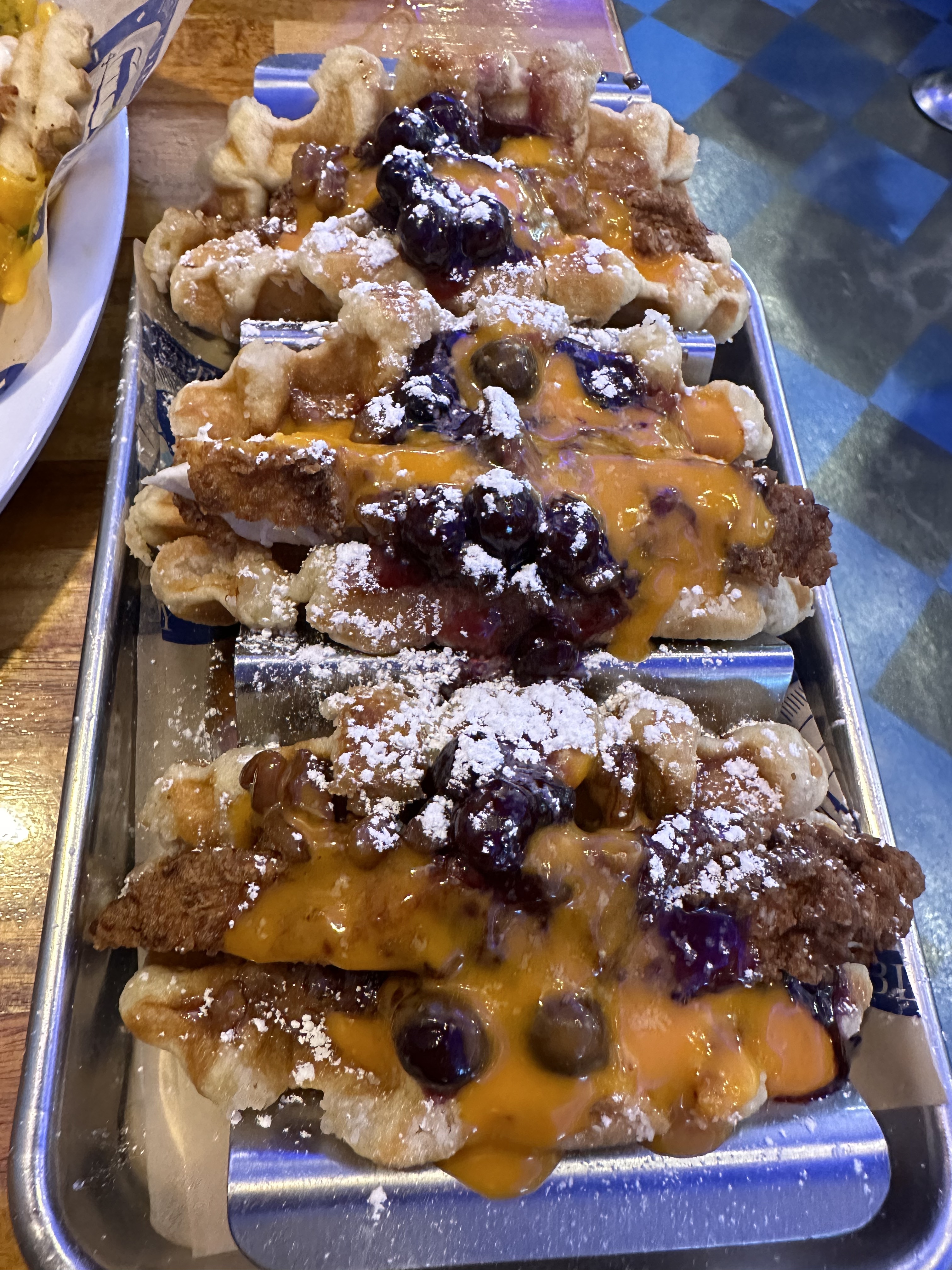 Treylor Park is designed to look like an Airstream and has an old-school diner vibe. We ordered the Treylor Park Nachos Grande and Hot Chicken and Waffles Tacos to share. The nachos are waffle fries topped with pickles, fried chicken, bacon, cheddar cheese, chive ranch, and balsamic gastrique. The chicken and waffles include sweet waffle, fried chicken, hot sauce, bourbon pecan maple syrup, blueberry compote, and powdered sugar, served in a taco stand. It was messy and difficult to eat with your hands even though it was meant to be a taco. R liked the food but I thought it was mediocre. The flavors were good but the dishes could have been edited and been better for it. Plus the food was not served hot which I hate. The service was good despite the (in my opinion) disappointing food.