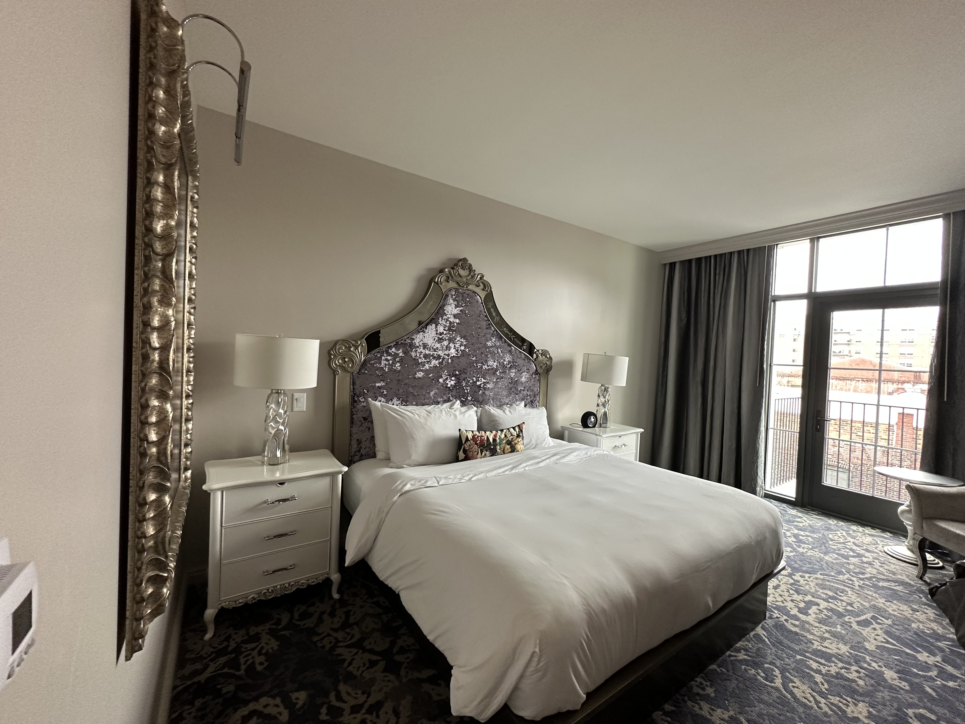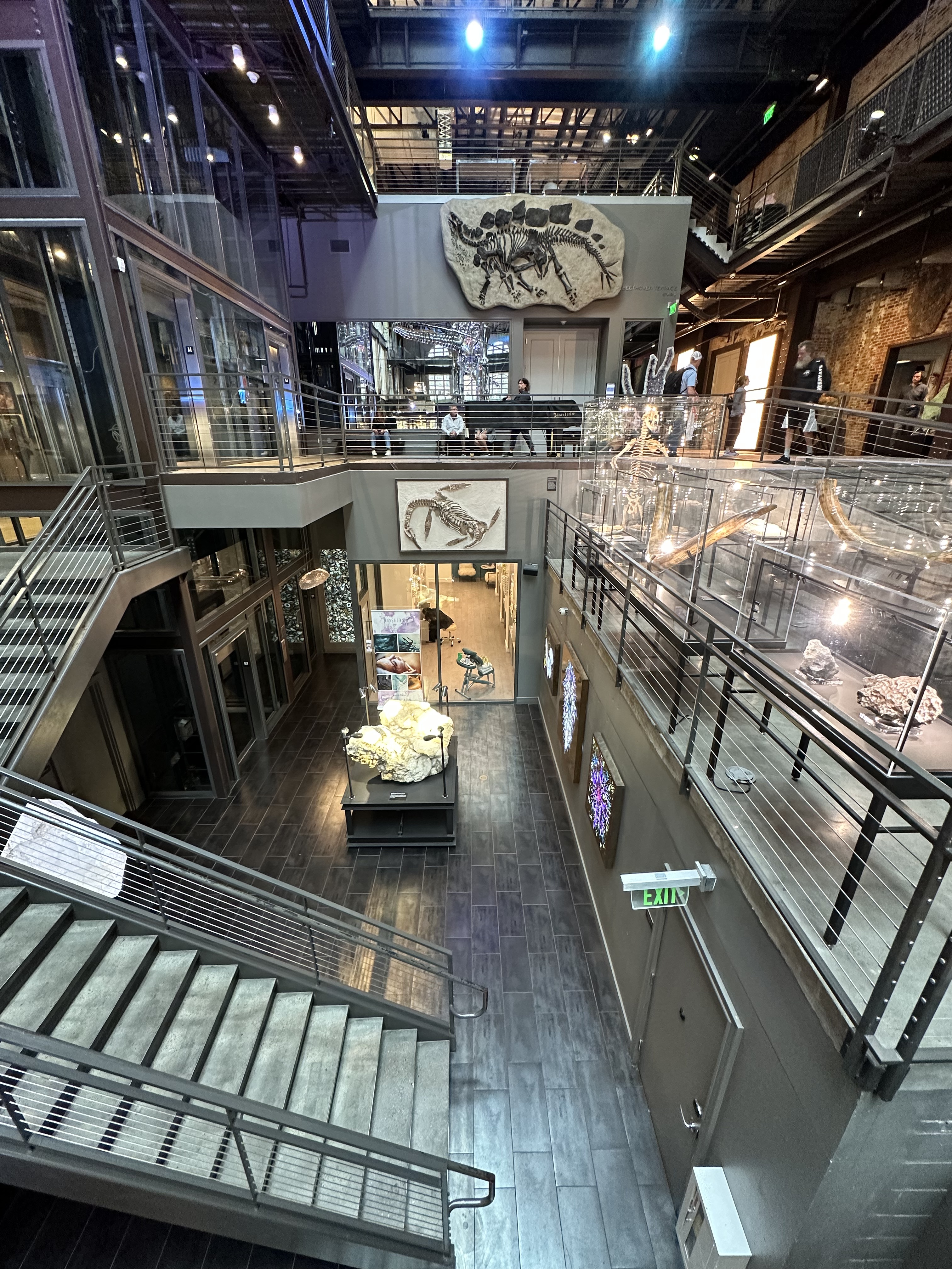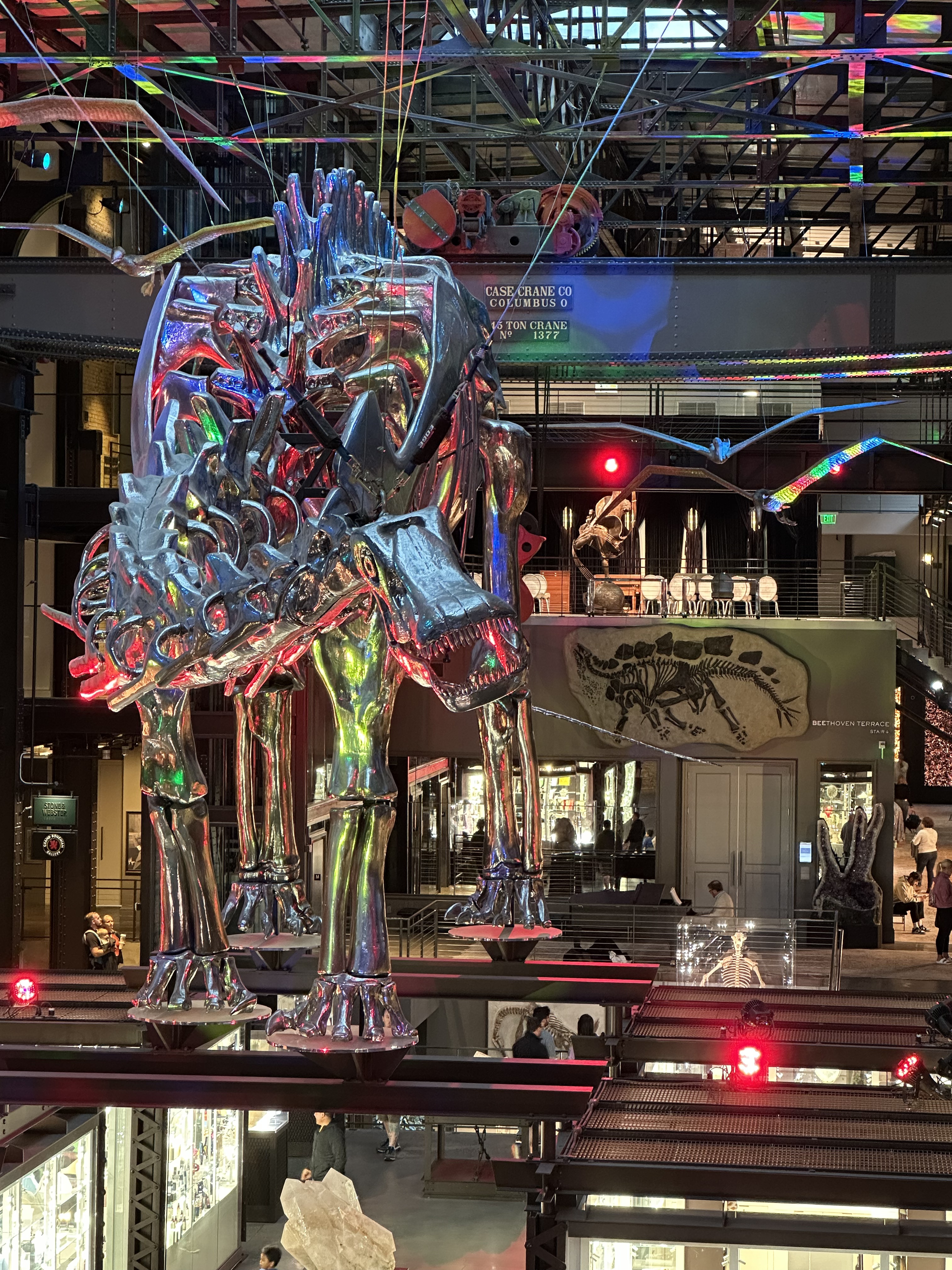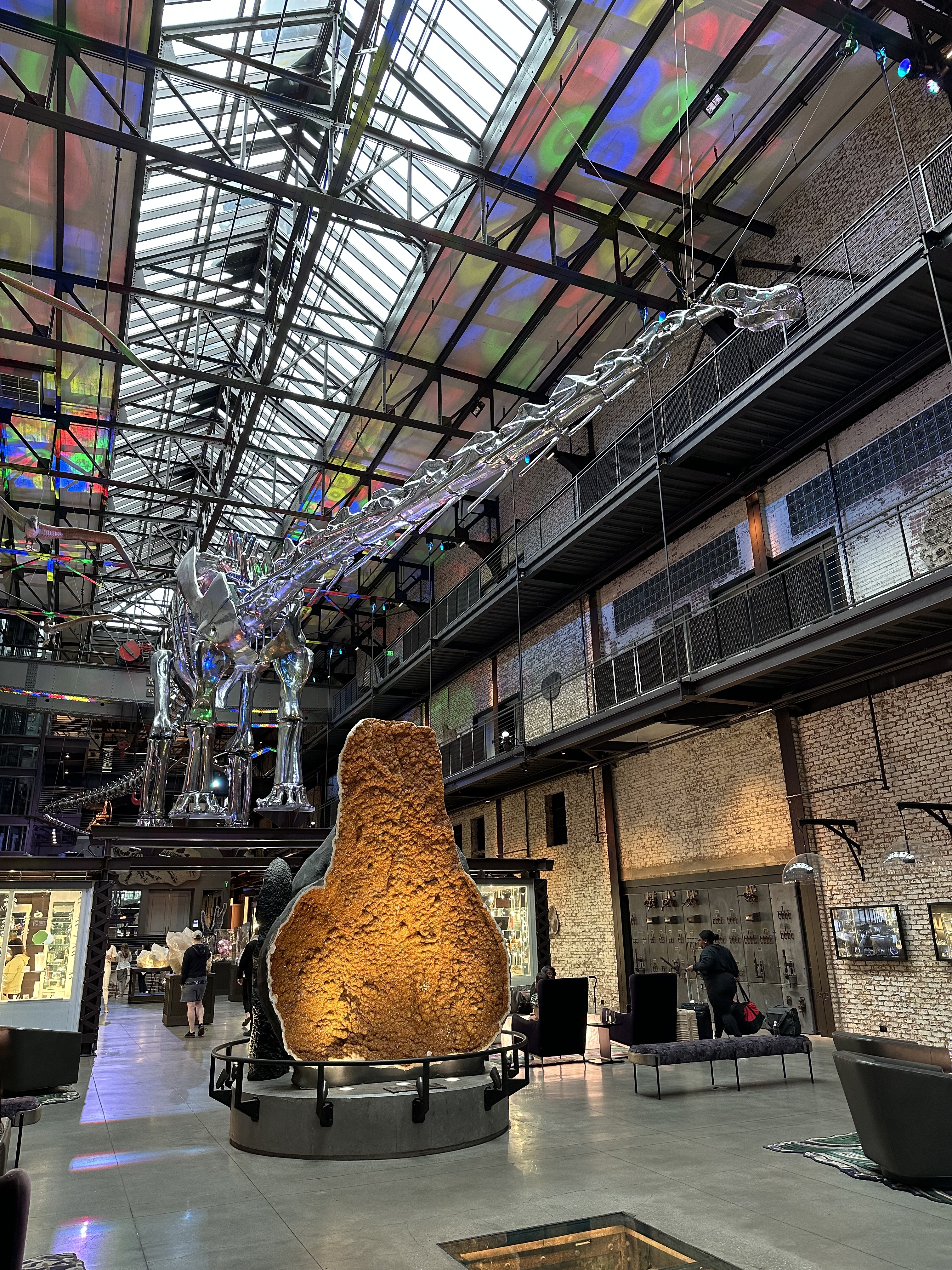 Once a power plant, the hotel blends modern comfort and convenience with old function and purpose. The property is composed of three main buildings with hotel rooms, shops, restaurants, and bars. Each building has its own signature style and design with chic architecture in the Power Plant, romantic styling in the Three Muses, and contemporary maritime in the Atlantic. There are additional restaurants on the river which are associated with the hotel and offer a more laid back vibe for food and drinks. The lobby of the Power Plant building is massive and there is a lot to see! There are geode displays and art work, components of the old power plant, fossils, and a dinosaur skeleton structure. The dinosaur looks really cool in the evening when the colored lights reflect off the silver of the skeleton.