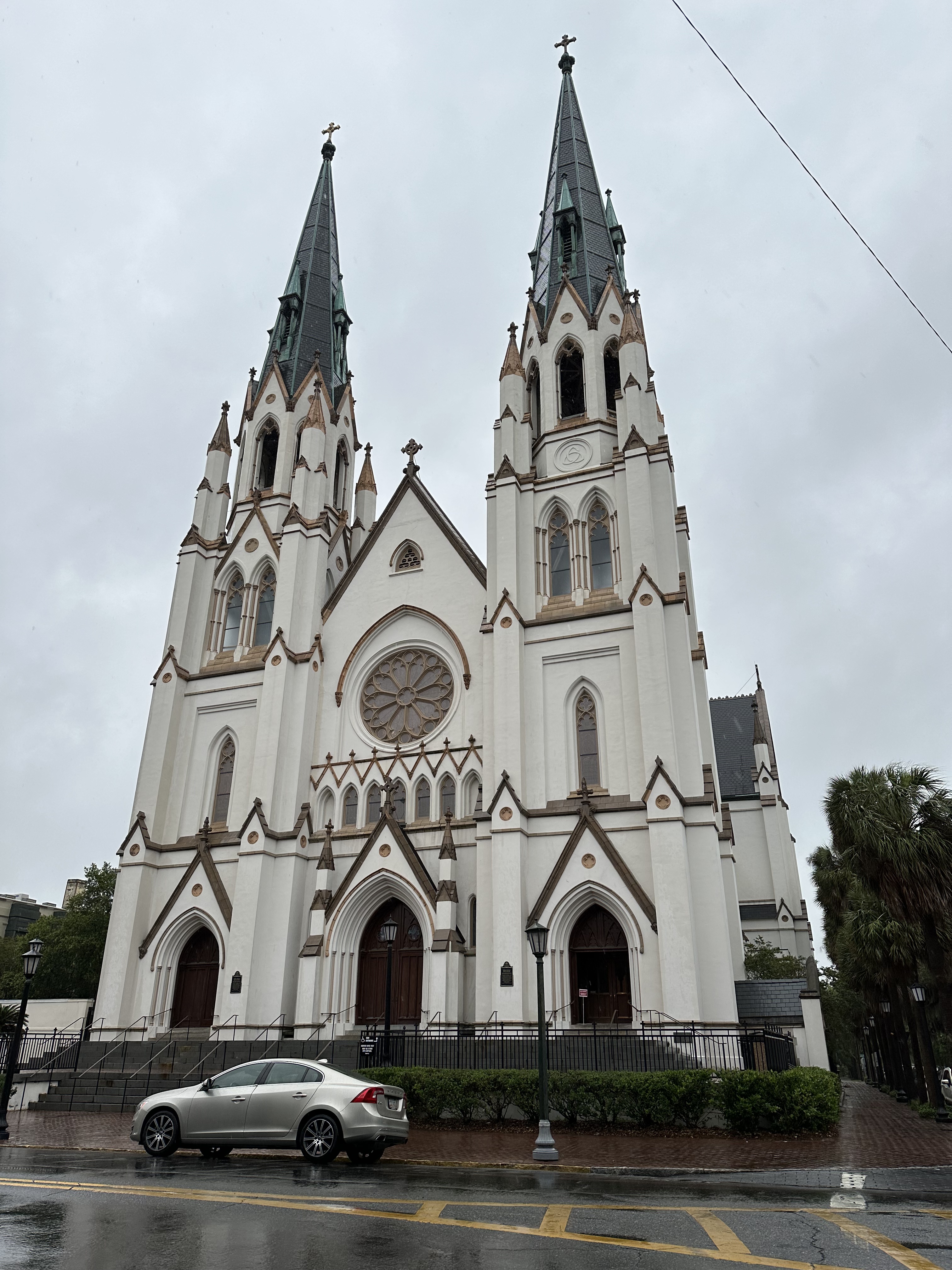 I was excited to tour the Cathedral Basilica of St. John the Baptist am disappointed that it was closed for worship. I realize that it is an active place of worship and am disappointed because I checked their online schedule multiple times to confirm it would be open. The rain was coming down, the cathedral was closed for worship, and the bookstore didn’t open for another 35 minutes so we huddled under the awning of the De Soto Hotel. At this point, I almost want to cry because this is the worst trip R and I have ever had together. Between the weather, things being closed, and misreading opening hours for at least one site, I’m frustrated, cold, and wet. I started doing a goofy little dance in an attempt to warm up which made R laugh and we descended into giggles and nonsensical things to make each other laugh. Disappointment fades and we pass the time until one of my favorite Savannah landmarks opens.