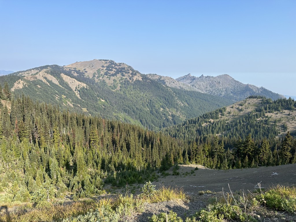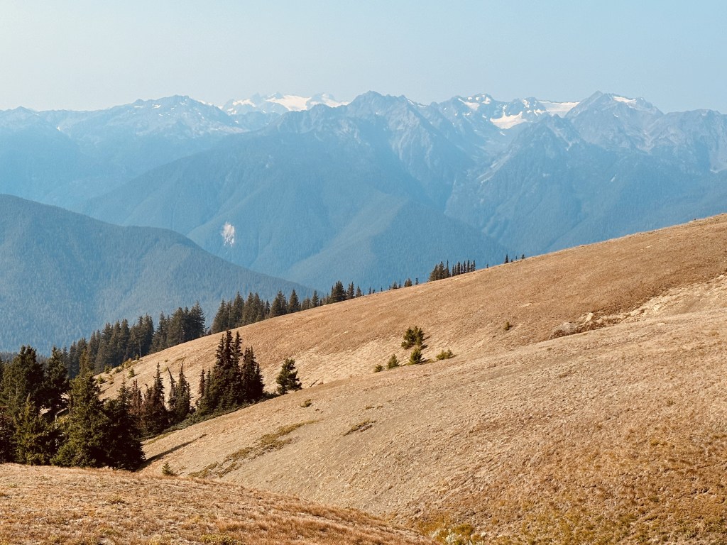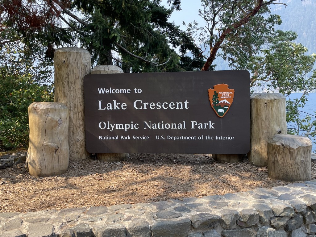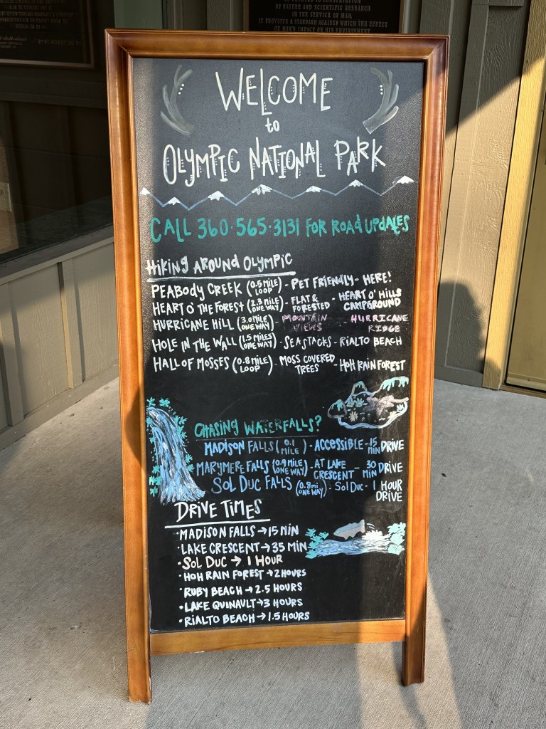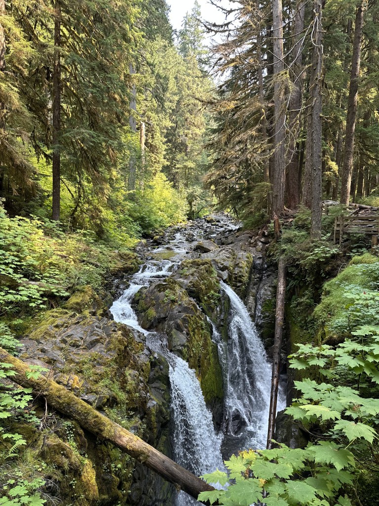 Olympic National Park is about a 2.5 hour drive from our hotel so we got an early start this morning. I put on an audio book while we drove and it helped the time pass quickly. We entered the park and drove up to Hurricane Ridge for some easy hiking and views. There are a couple wildfires creating some issues with smoke and closures in the parks so we had to read signs and take pictures for later reference. It was slightly hazy/smokey on Hurricane Ridge but it wasn’t so severe that we were unable to enjoy it. We saw a marmot and sat watching him for a few minutes before continuing onward. Mom was excited to see the Sol Duc Falls so we drove to that area of the park.