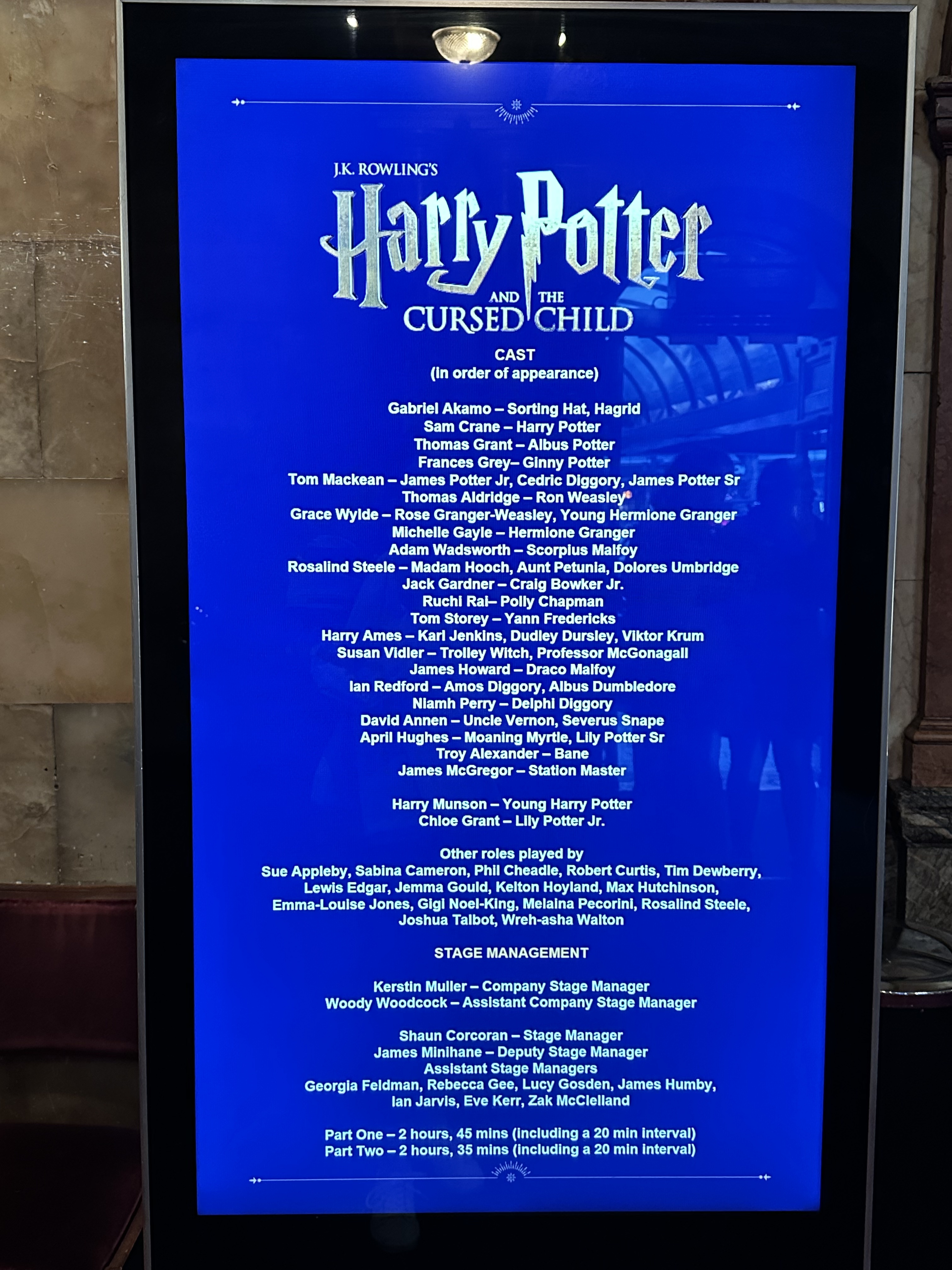 We walked the short distance to the Palace Theatre for part one of Harry Potter and the Cursed Child. I am so excited to see this performance! R and I grew up reading the Harry Potter books and we have visited both Warner Bothers Studios London and Universal Orlando for the Harry Potter experiences. We’ve wanted to see the show for years but the timing hadn’t worked out until this trip. The Palace Theatre is beautiful and the interior looks like it belongs within the walls of Hogwarts. There is a quick security check, souvenir stand, and bar you can stop into before the show. We found our seats and settled in for the 2 hour 40 minute show, 20 minute interval included.