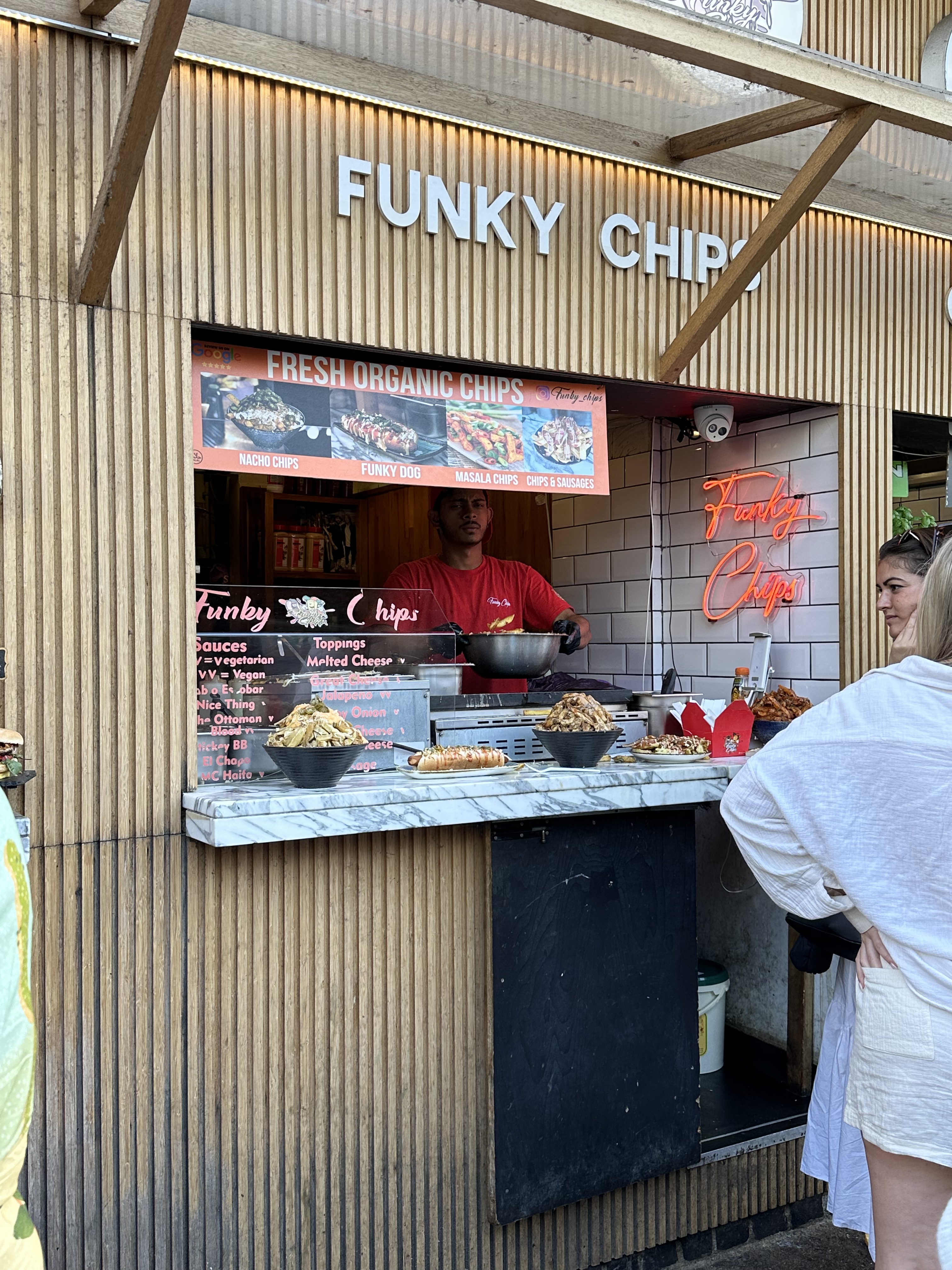 Our first task was to remedy my ravenous stomach and that was an easy task given the number of food options. I chose Funky Chips because 1) I love potatoes, 2) they looked really good, and, 3) though I didn’t realize it immediately, there was a massive line for them which is usually an indicator that it is good. Funky Chips is located in one of the stalls and they had an employee with a tablet working through the line taking orders. Once we got to the front of the stall we confirmed our order number and watched as they made our chips. We ordered the small cheesy chips which consisted of about 3 pounds of fried potato slices covered in cheeses and seasonings. They were delicious and the two of us managed to eat nearly the whole thing.