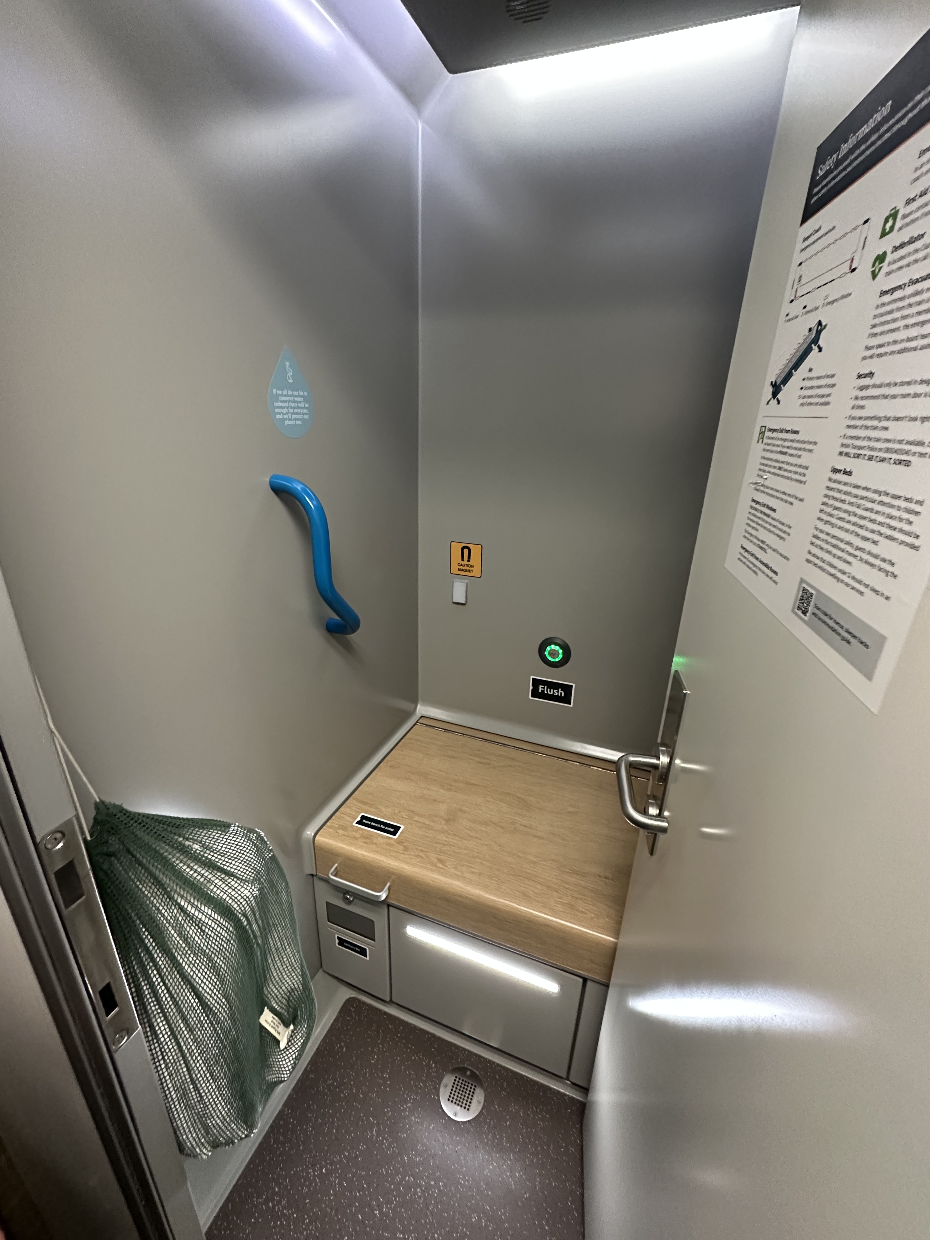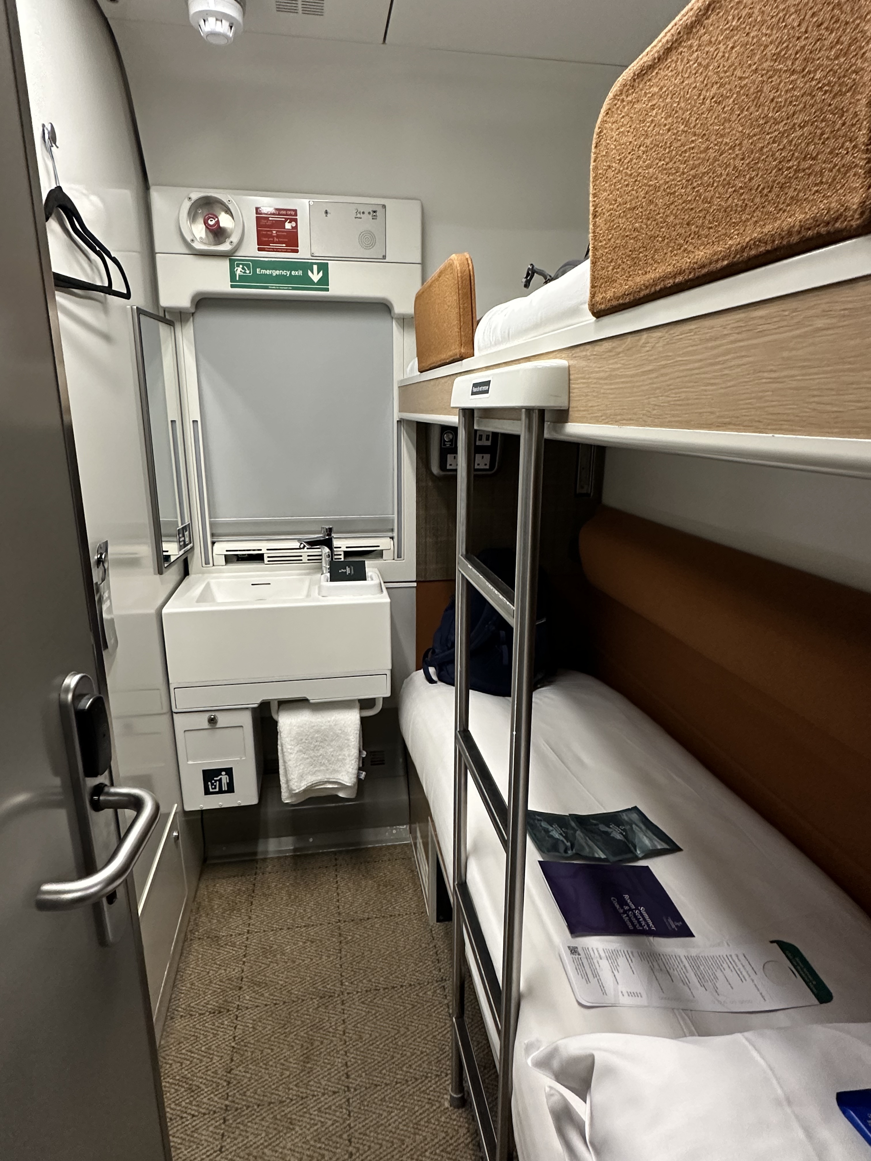 The lounge announced boarding commencement so we walked to the platform for check-in. We each have a checked size bag and we quickly discovered those bags do not fit in the cabin. We took the bags to the luggage car then went back to settle into our cabin. The cabins are small, only a backpack and (maybe) a carry-on size bag will fit under the beds. Plan on one small bag per person, effectively. The washbasin is in the cabin with the beds while the toilet and shower are in a separate area. Raise the bench-style lid to access the toilet. The shower is not an on/off setting and you have to continue to press the button for water. It isn’t terrible but it was a little annoying when trying to rinse off.