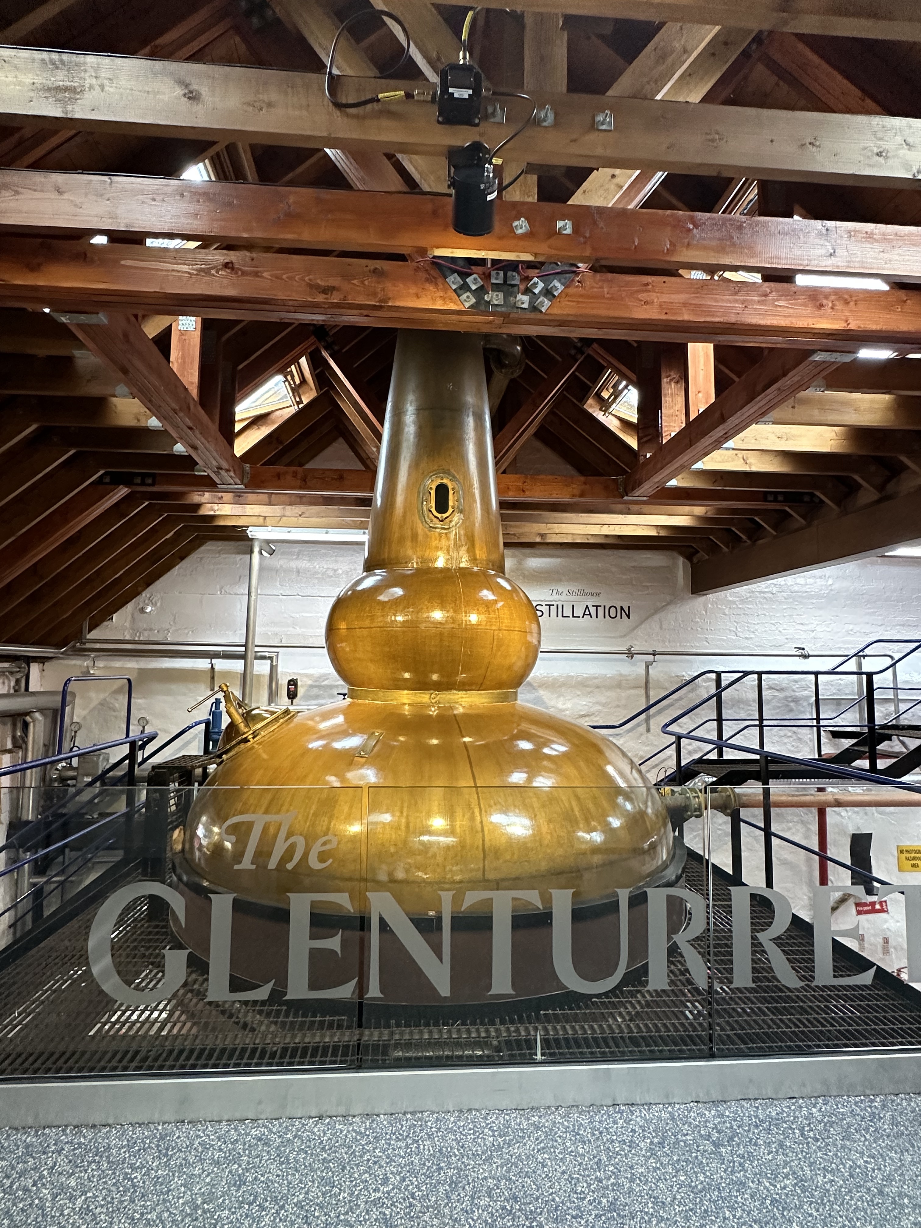 Scotland’s oldest working distillery, Glenturret is beautifully nestled in the foothills of Crieff. You drive through lovely golf courses nestled in the countryside before ultimately arriving at Glenturret. The distillery’s earliest rental documents date to 1763 and an honor roll of writers, poets, Prime Ministers, and skilled and dedicated distillers speak to its legacy. The white buildings standout in sharp contrast to the lush green of the surrounding countryside.