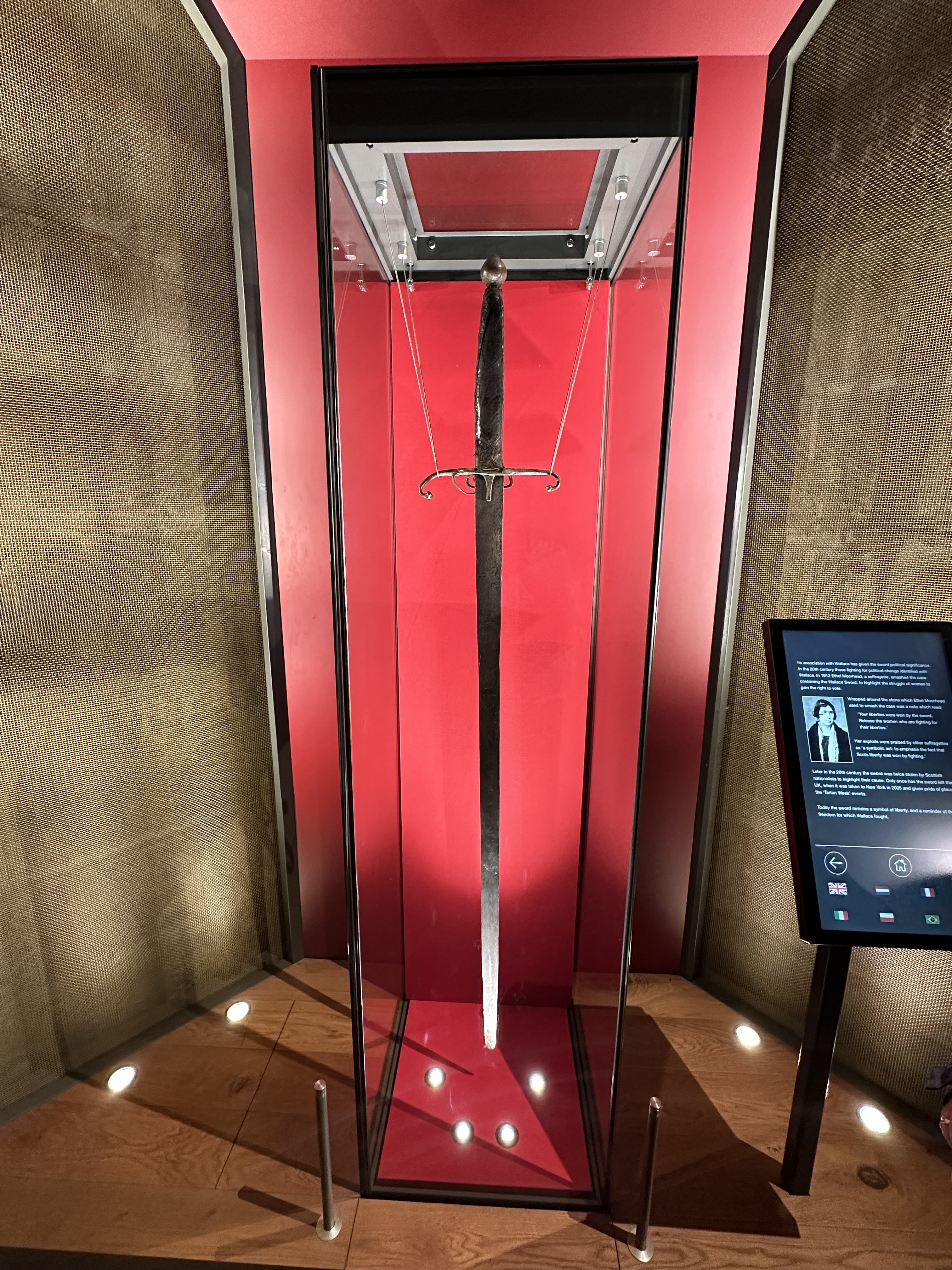 After another two hours of driving, we arrived at the National Wallace Monument. This is one of the most distinguished landmarks in Scotland, and particularly in Stirling, with views overlooking the scene of Scottish victory at the Battle of Stirling Bridge. The location, history, and visibility of the monument continues to attract travelers, weddings, special events, and filming crews. Visitors embark on a journey up the 246-step spiral staircase to take in the Hall of Arms, Hall of Heroes, and Royal Chamber. The Hall of Arms is the first floor gallery inside the monument and it details how William Wallace has been remembered over the centuries. This room aims to shed light on the man who rose from obscurity to become an enigmatic leader of the Scots. You will also see the Wallace Sword in the Hall of Arms. The impressive two-handed sword measures 1.68 m (5.5 ft) and weighs 3 kg (6.6 lbs).