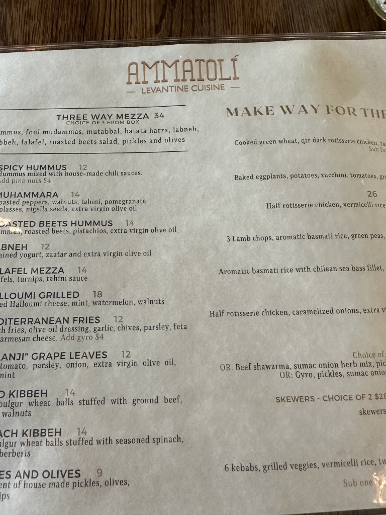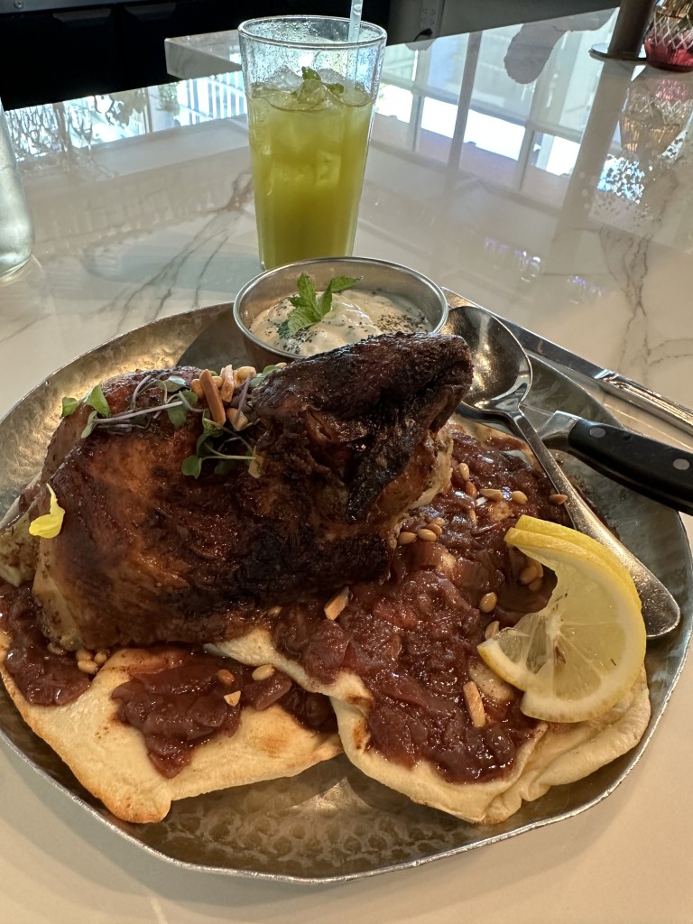 Sip on Ammatoli’s Mint Lemonade which is as refreshing as it is tasty. Opt for the Three Way Mezza to enjoy a sampling of appetizers. I chose the hummus, falafel, and pickles and olives which pairs delightfully with the house made pita bread. I chose the Spicy Garlic Lemon Chicken which was delicious and had just enough spice for a slight tingling sensation but not so much to blow my palate. I loved the food and the atmosphere so much I returned for a second meal where I ordered the Mint Lemonade and Palestinian Msakhan. Both meals were incredibly satisfying and enjoyable.
