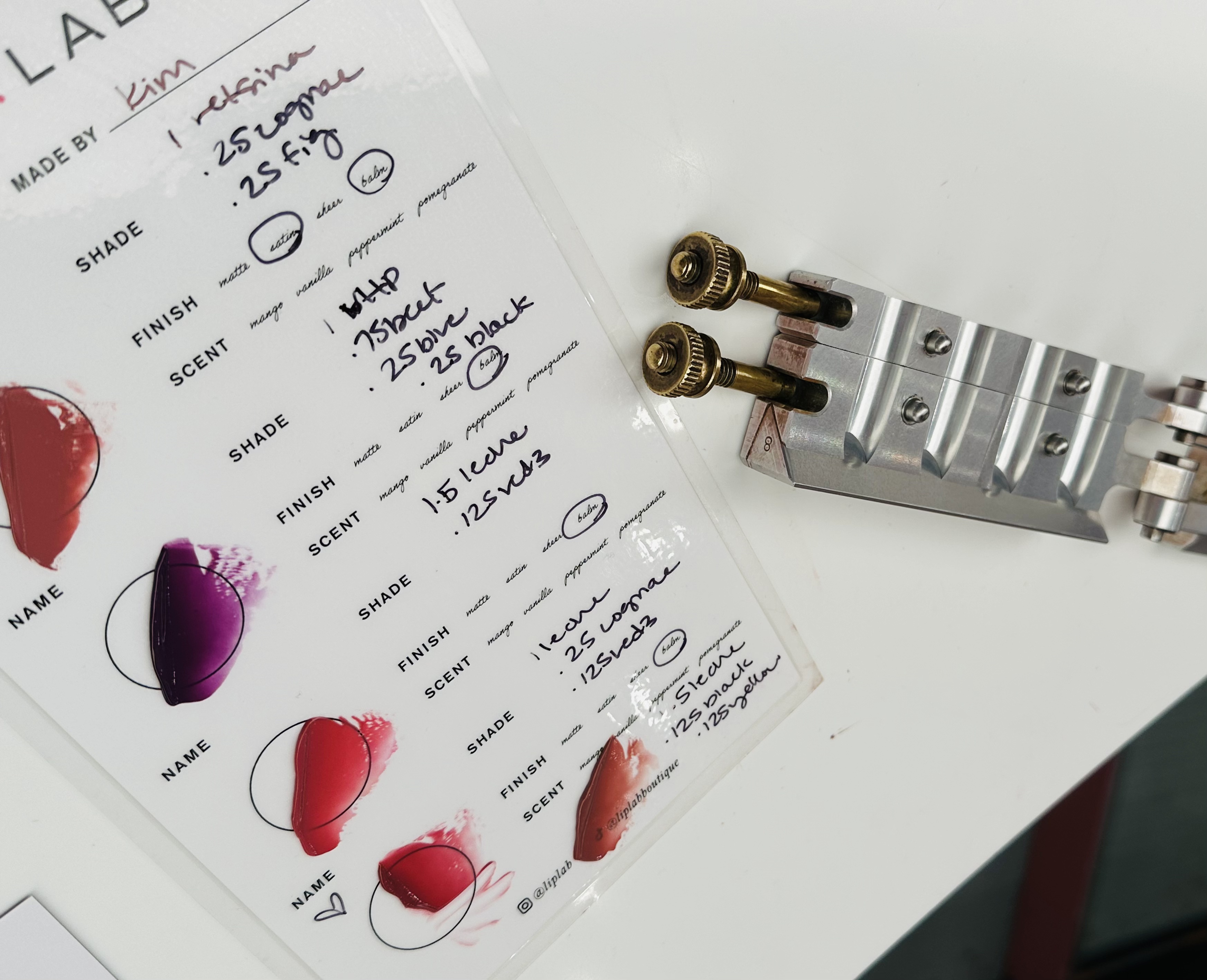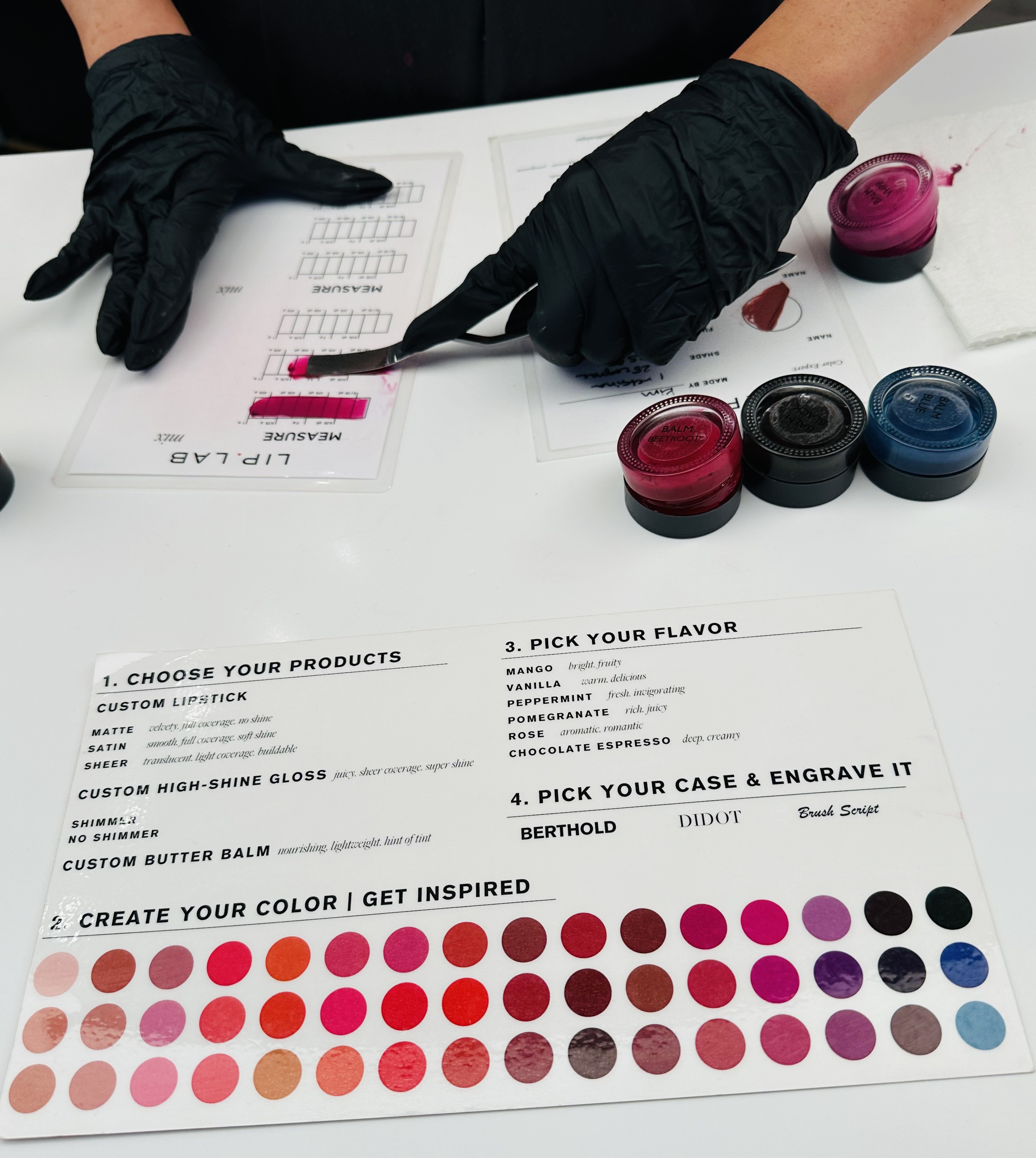 While you get to choose all the elements of your customized lipstick, you don’t actually mix it. The color expert is trained on color matching, both the art and the science. All custom Lip Lab products are physically mixed, poured, and manufactured on-site for you. I will add, I appreciate the level of hygiene and sanitation with this process as well. My color expert wore gloves and cleaned/sterilized each tool before and after use. (This is a pet peeve I have with a lot of cosmetic stores and the lack of hygiene!)