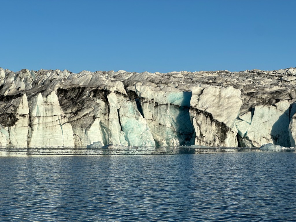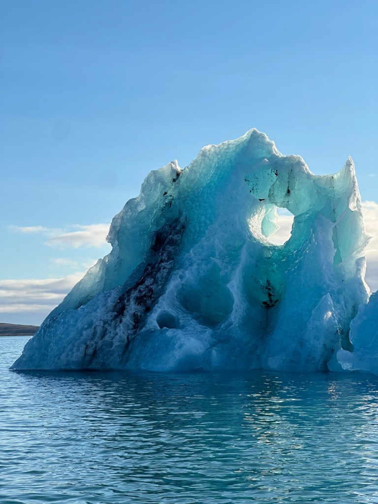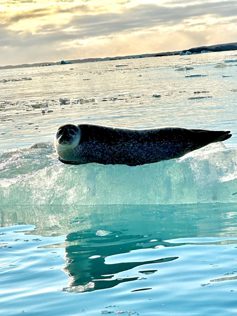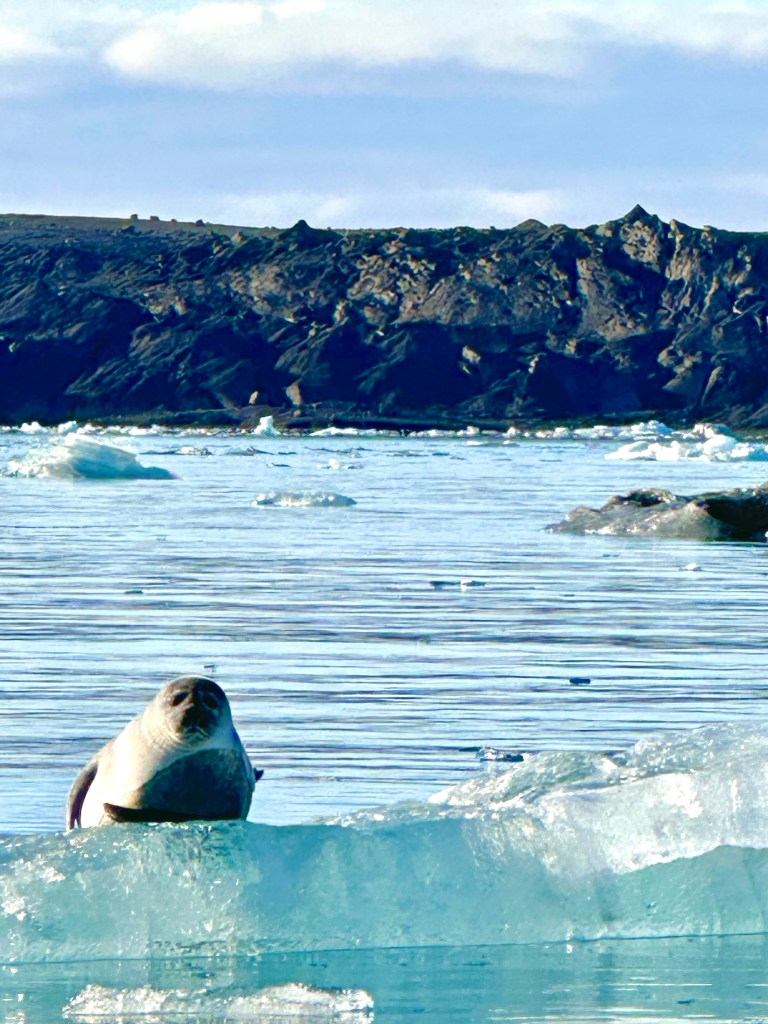 While on the tour, you may have the opportunity to actually hold a piece of the glacier! Our captain grabbed a small piece of ice that calved off the main glacier and was floating near the boat. The texture of the surface was full of ridges and rivets (think about the surface of a gold ball but bigger), not at all the smooth surface I expected! We continued a leisurely ride around the lagoon, taking in the glacier and the lagoon from multiple angles. It was a clear, sunny day and I was ecstatic to see seals! As an animal lover, I am very happy any time I get to see the wildlife! The seals sunbathe on icebergs calved from the glacier and most are tolerant of the noise of boat motors. We were able to get close enough for some good pictures without getting so close as to upset the seal or pose any danger to seal or human.