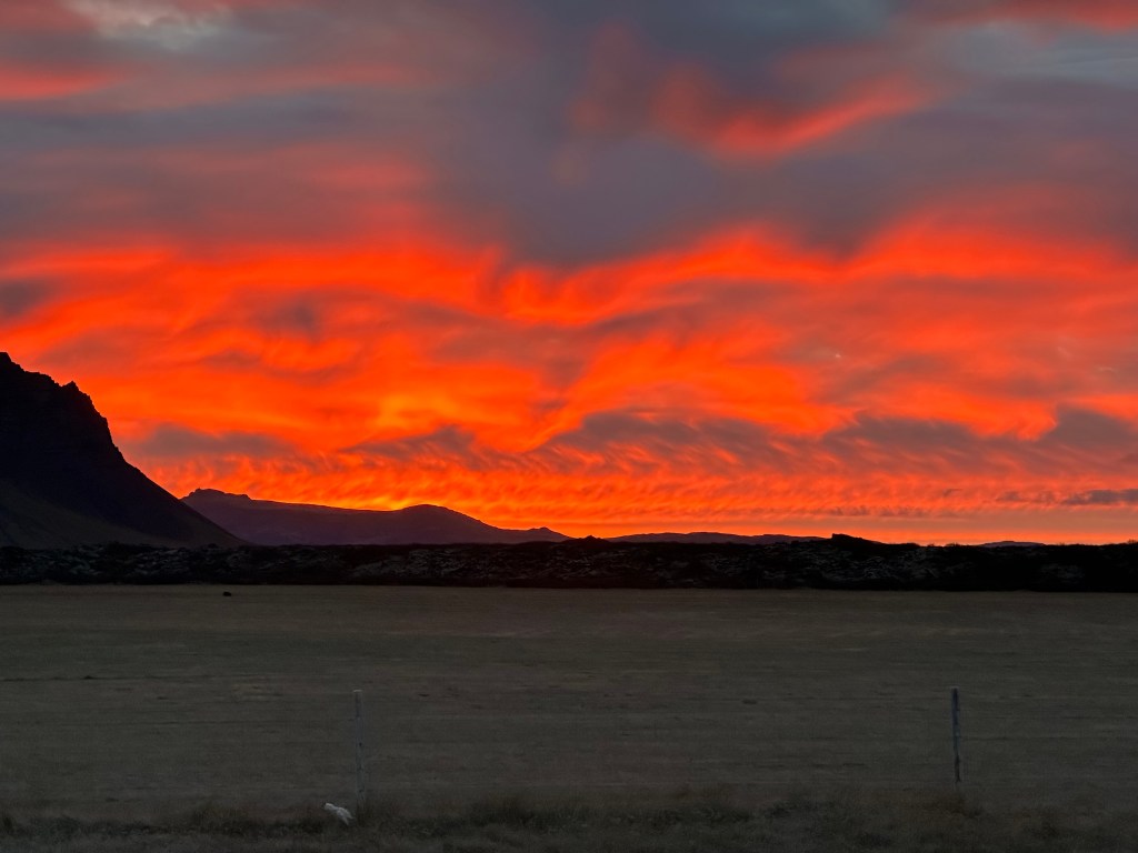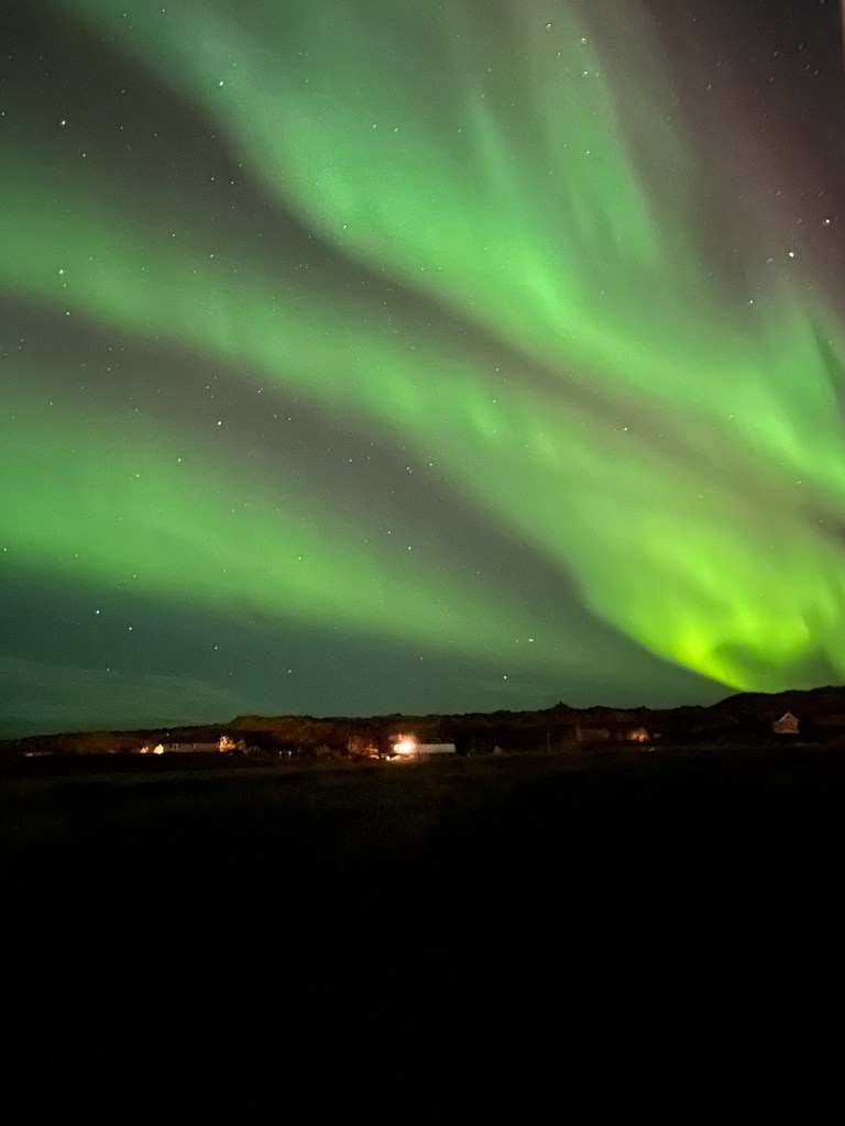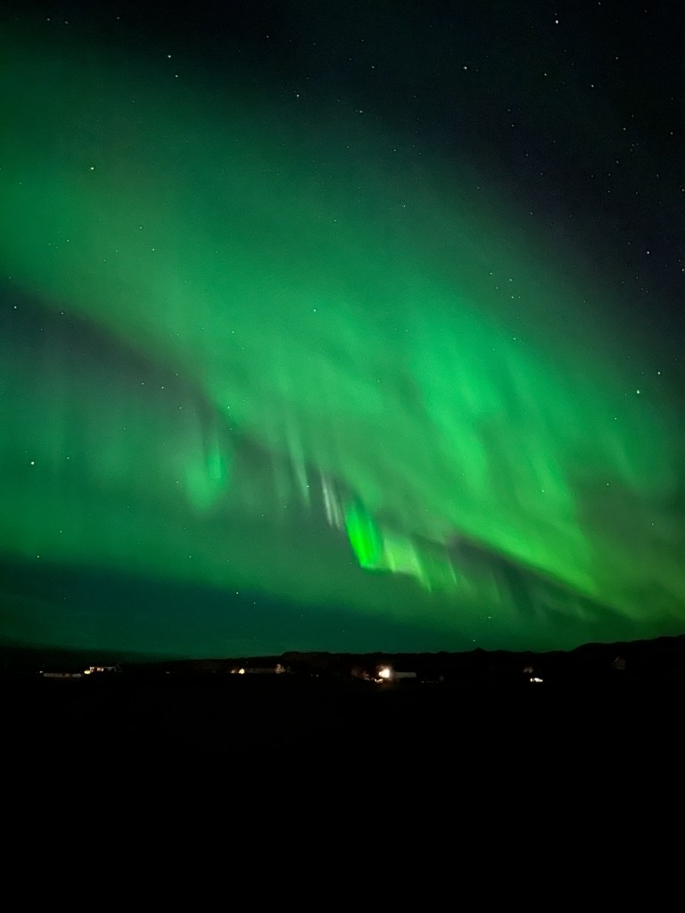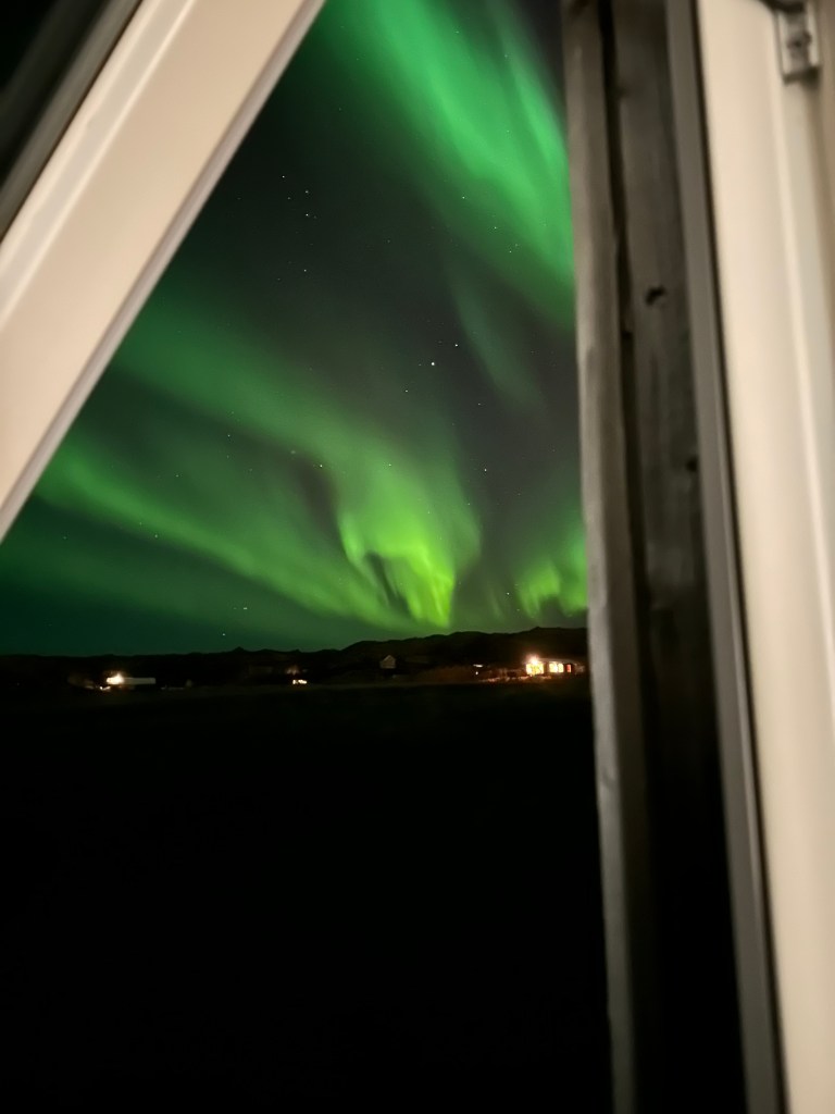 After a full day of sightseeing, we made our way to our hotel for the night. Arnarstapi Hotel is on the peninsula in a small community with a restaurant on site and a couple others within easy walking distance. The rooms are clean and comfortable, and they offer some of my favorite Northern Lights viewing opportunities! This was the one hotel stay where I could just look out the window and clearly see the Northern Lights without layering on clothes and going outside. The combination of opening windows and minimal light pollution made this a breeze. Since most all Icelandic hotel rooms are fitted with blackout curtains, I could brace my elbows on the window frame and stand between the window and the curtains to capture pictures of the dancing sky.