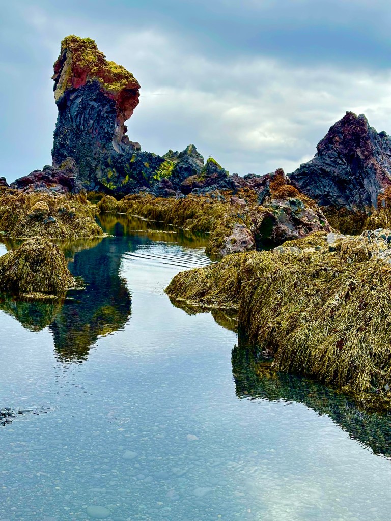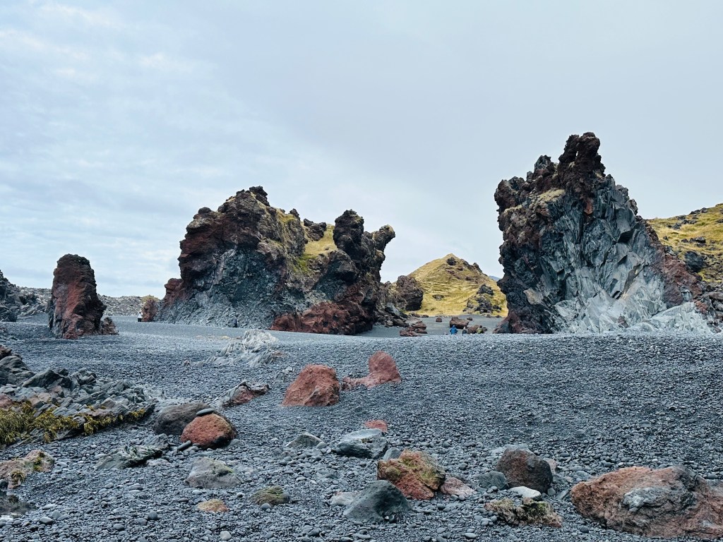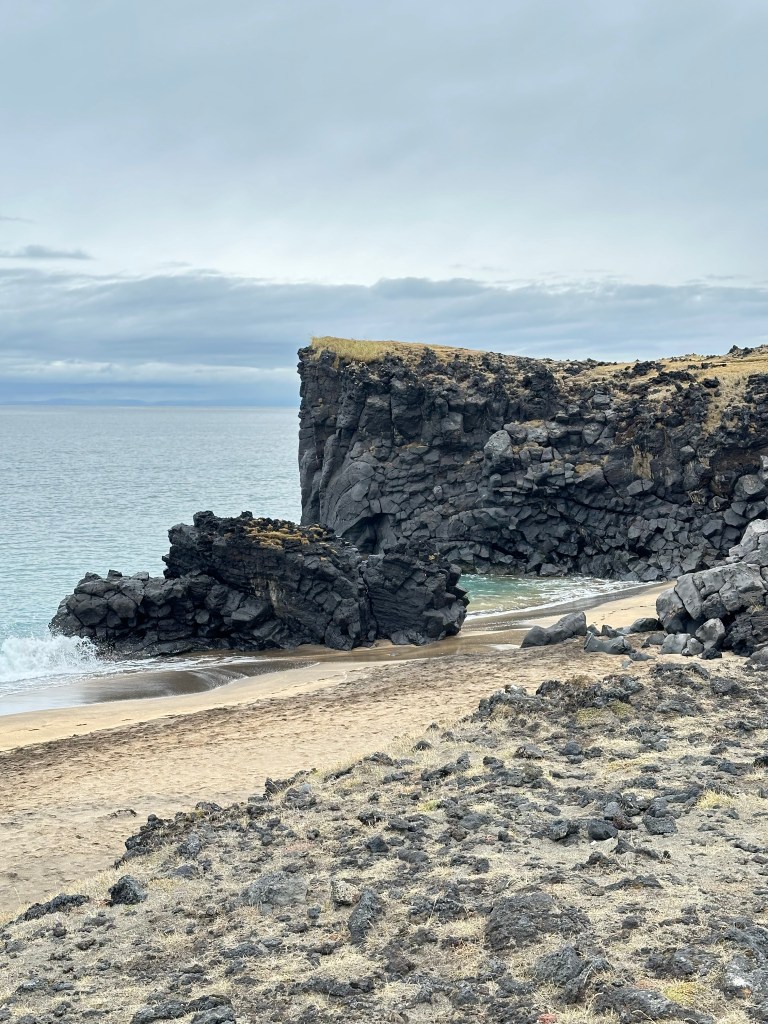 A short drive onward brings you to Djupalonssandur Black Sand Beach in the Snaefellsjokull National Park. Djupalonssandur offers the opportunity to stroll along one of Iceland’s black sand beaches. Once home to a thriving fishing station, the area is now entirely uninhabited. Follow signs from the parking lot to the beach, walk through the canyon of gnarled lava rock towers to the beach, about a 10 minute walk. The beach is full of small black lava “pearls”, pieces of lava rock worn smooth by the water. Interestingly, these black lava “pearls” are protected by the Icelandic government so don’t pick them up to take home. Chunks of the British trawlerEpine washed ashore after the vessel became shipwreck in March of 1948. Wlaking along the beach is beautiful but stay well back from the surf. This beach, like many in Iceland, is known for the strong tide and dangerous sneaker waves.