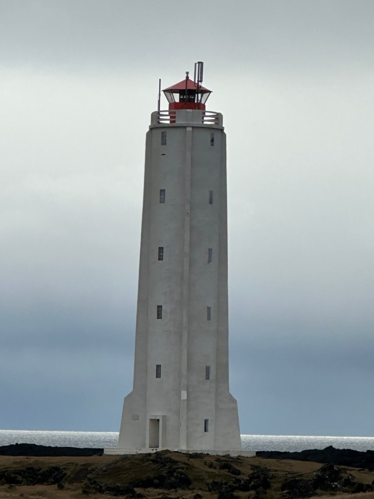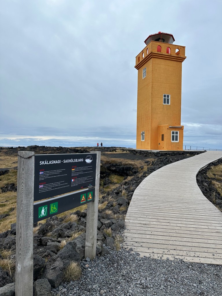 After a nice beach walk, we still had several daylight hours so we stopped at Malarrif Lighthouse. There is a national park visitor center with WCs and a small exhibit on the park’s geology. You can hike about a mile to reach the rock formations of Londrangar or you can stop in the visitor center, snap some pictures of the lighthouse, and continue on. This is an area where it is possible to see arctic foxes in the lava field and whales and seals in the ocean, but, as with all animal sightings, it is not guaranteed and the wind can be challenging.